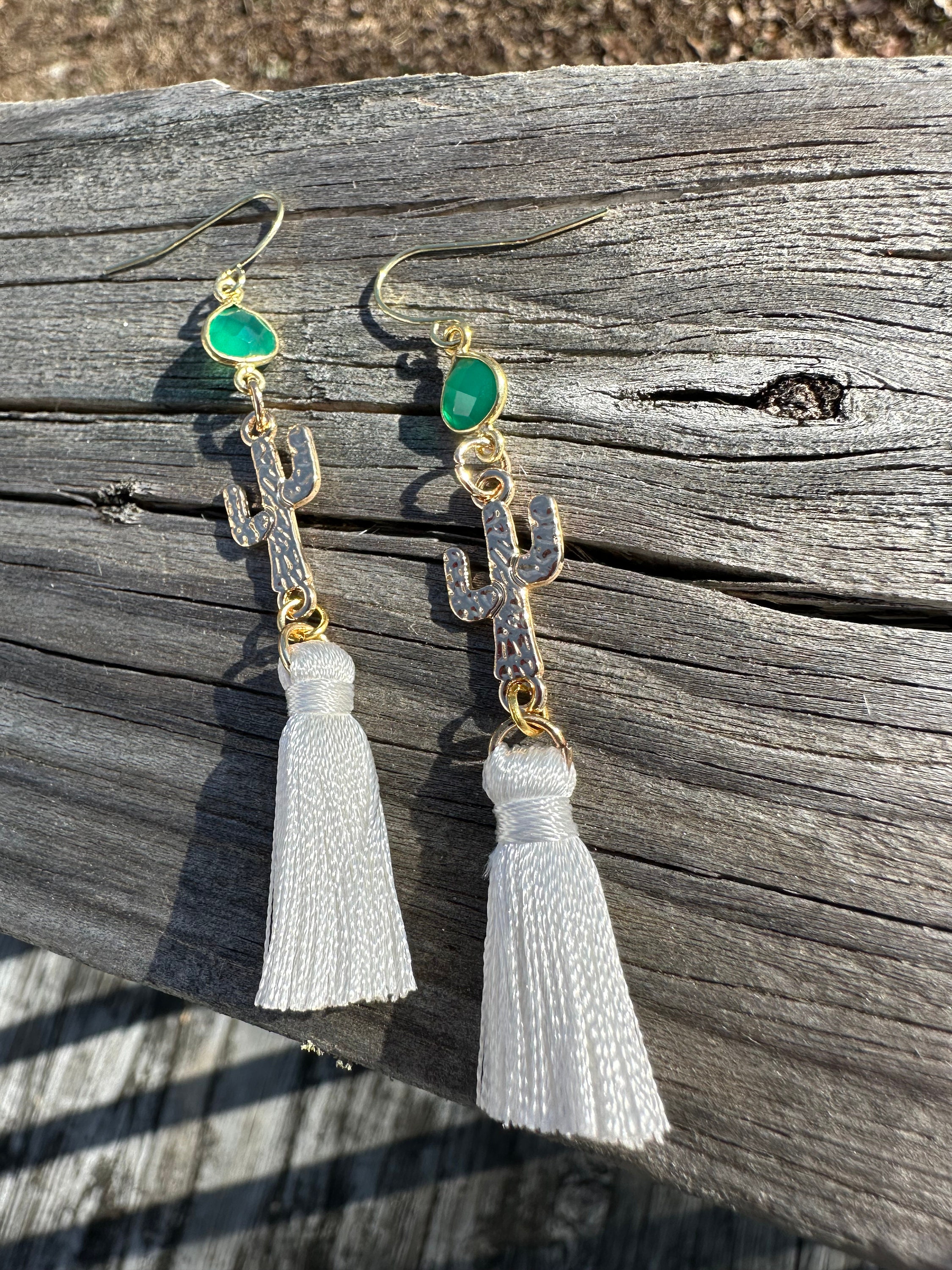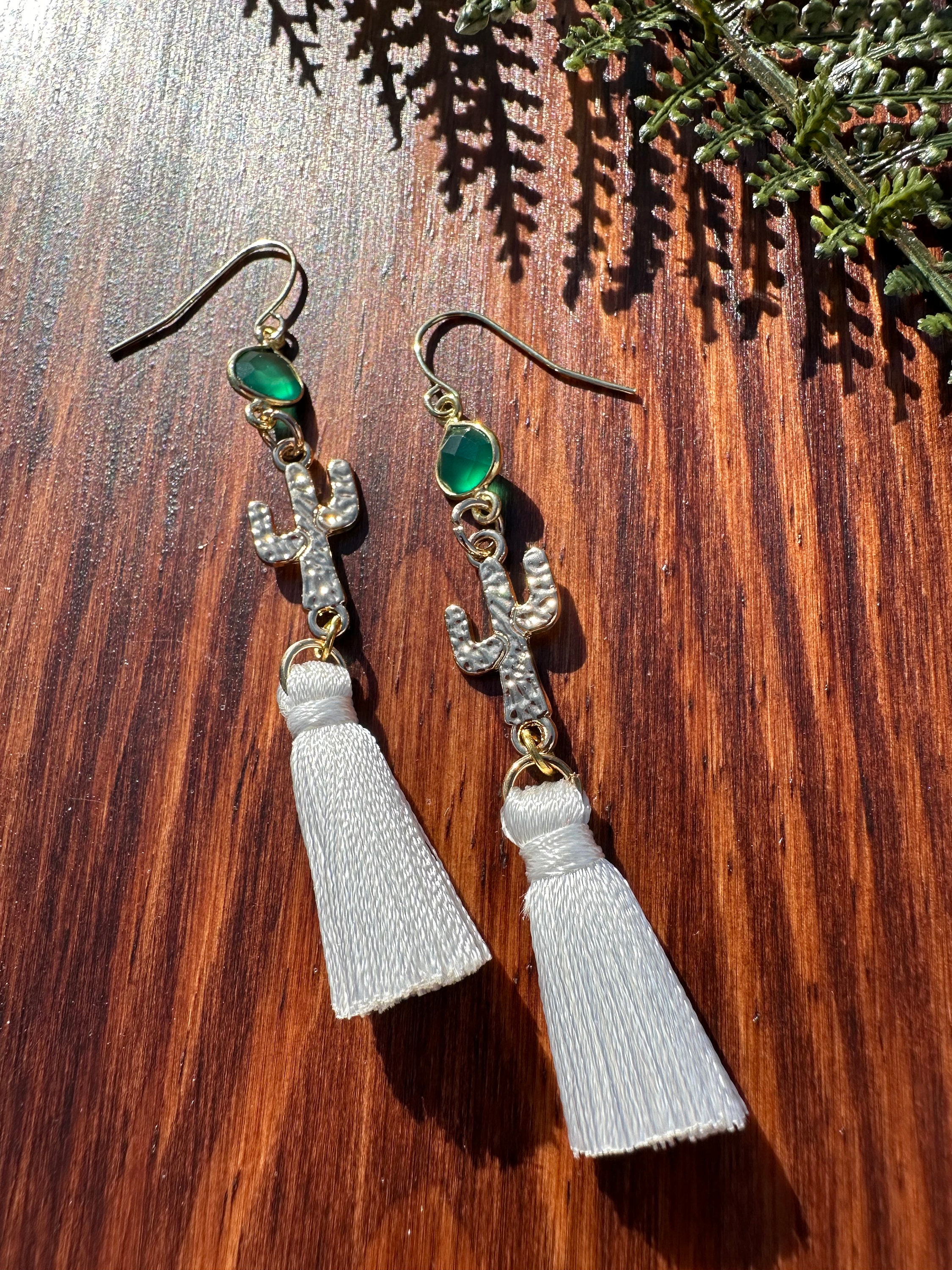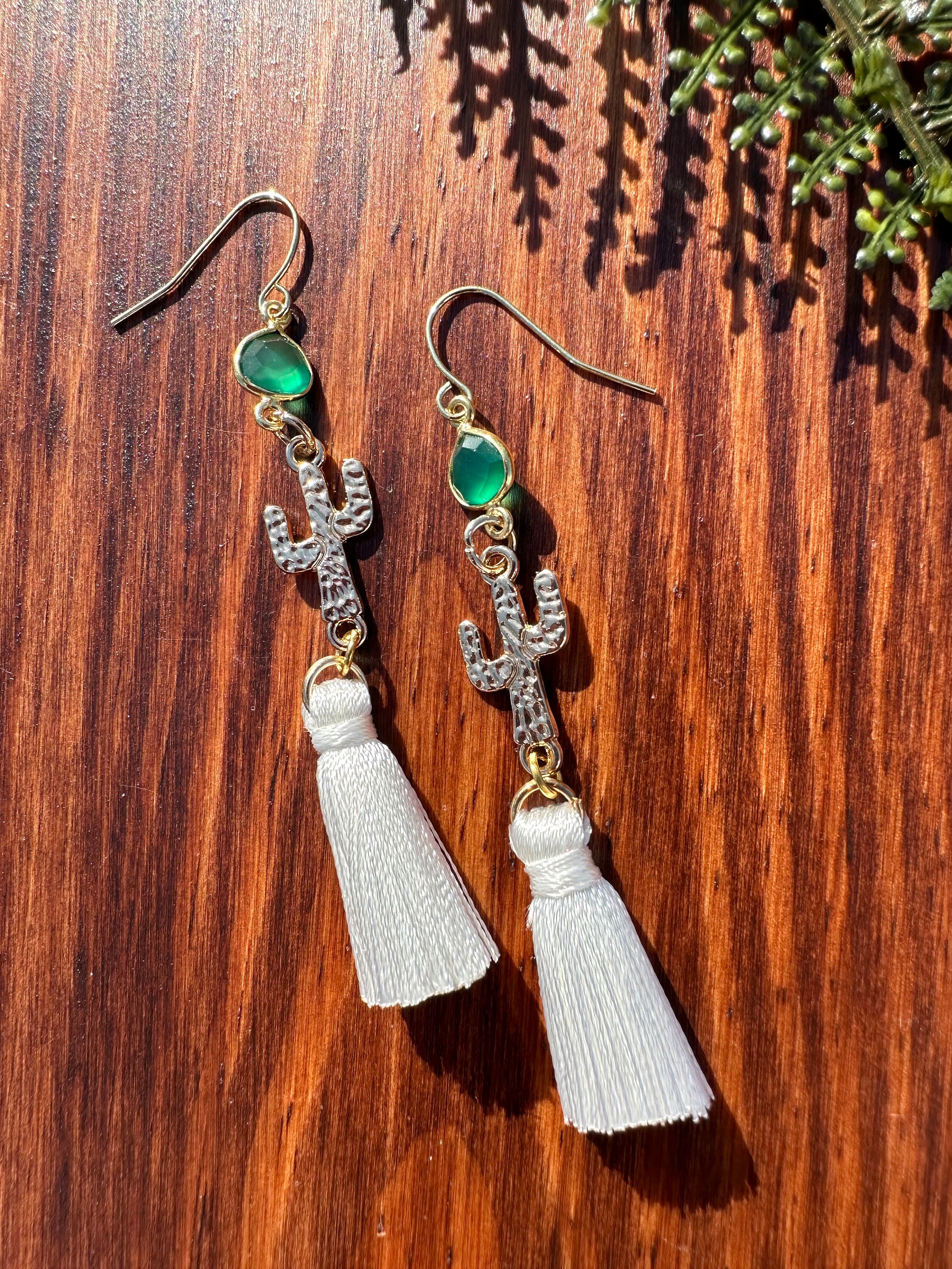 These dainty drop earrings are just too cute and perfect for summer! Gold accented cacti accompanied with beautiful faceted natural gemstones and white tassels. These earrings are ideal for lovers of succulents, cacti, and other plants.