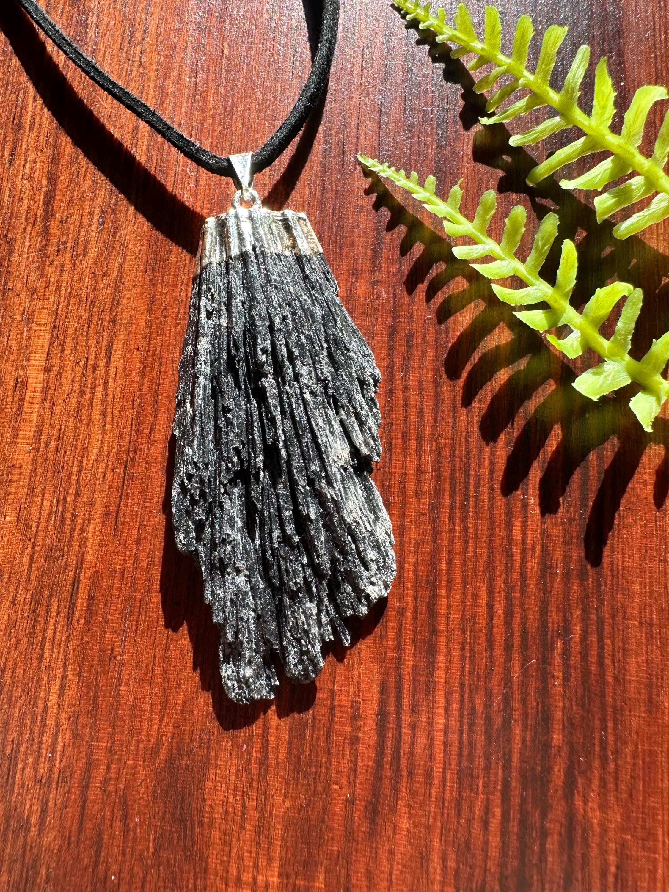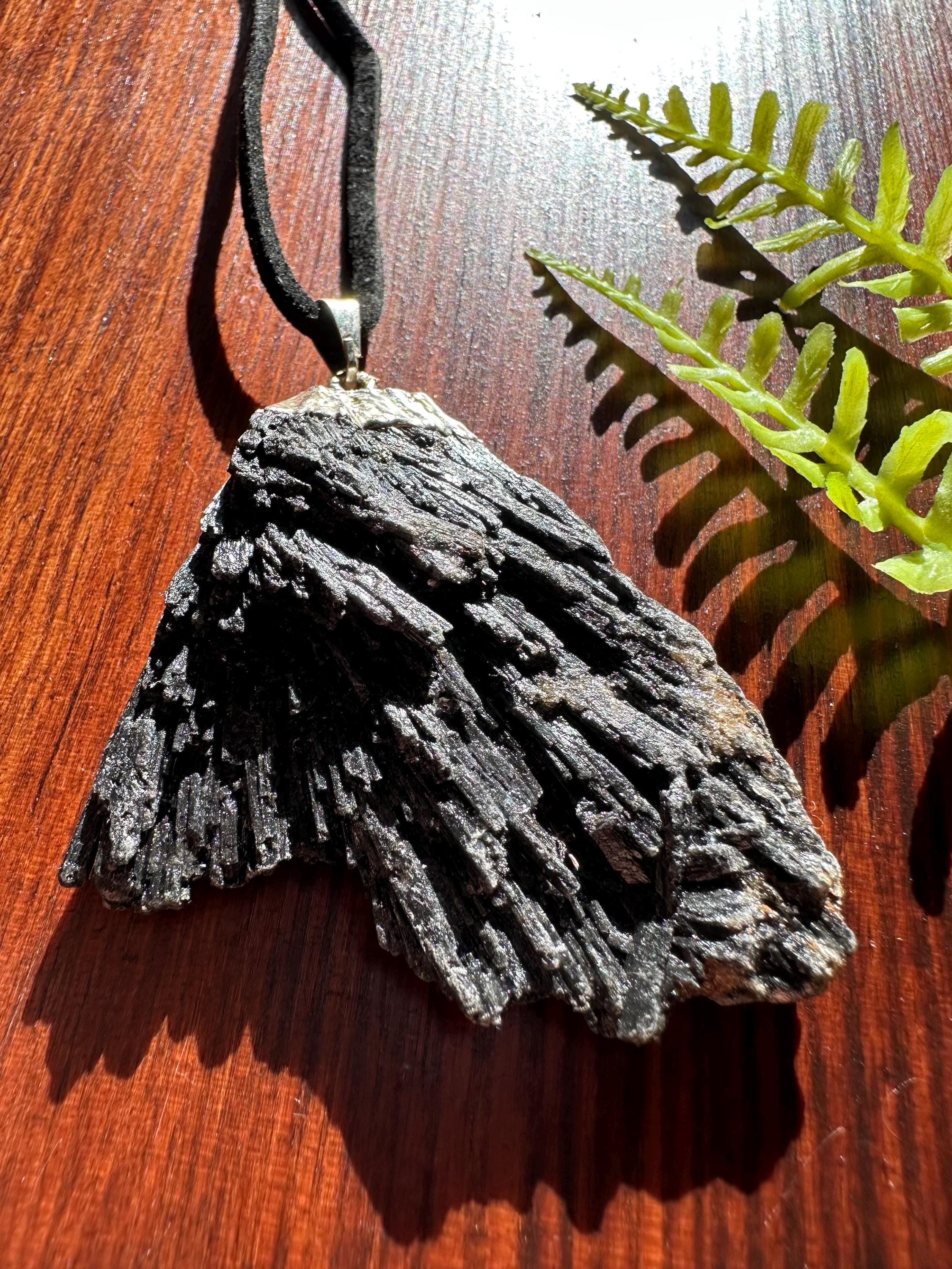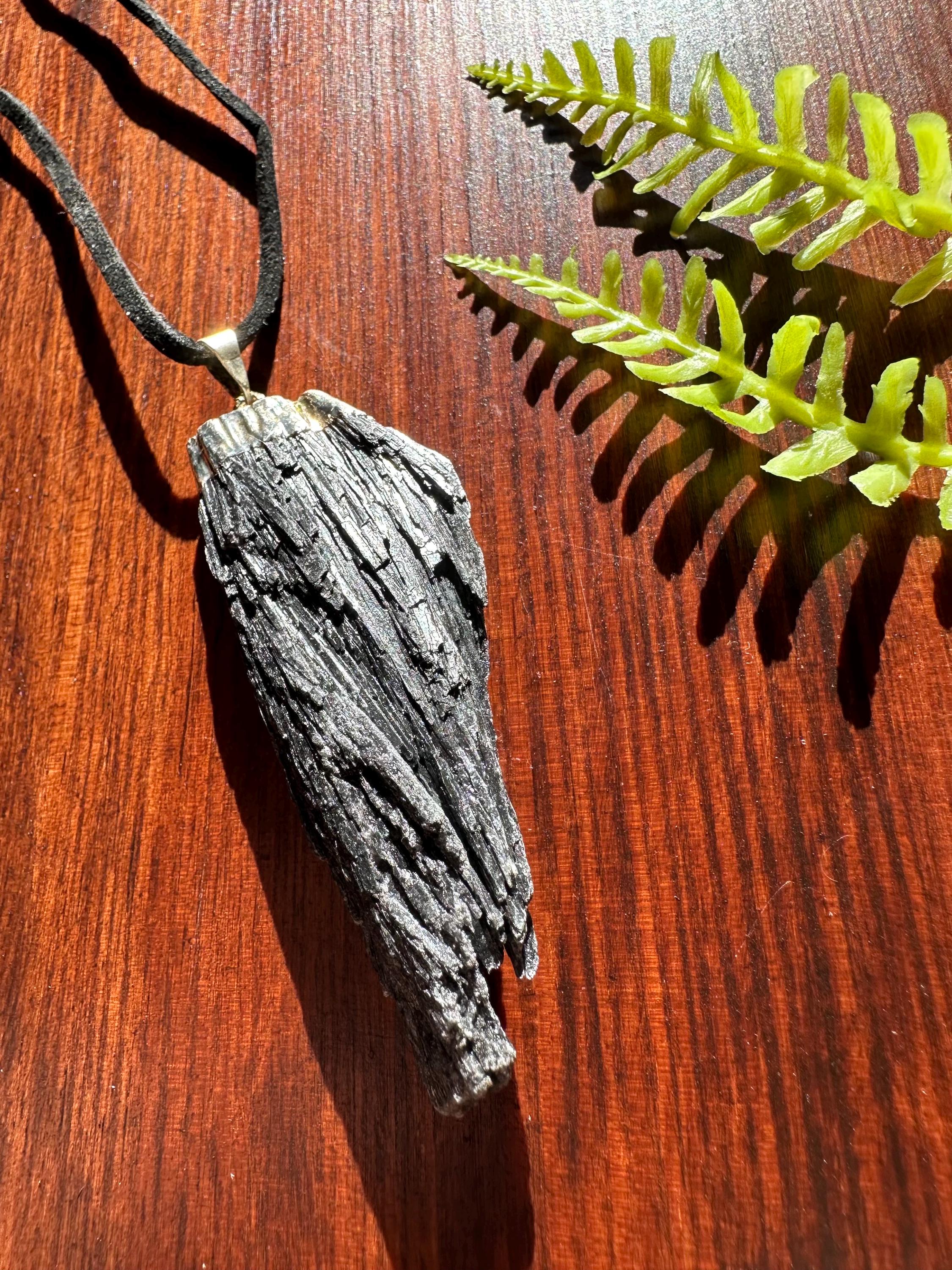 Absolutely stunning, natural black kyanite soldered into a statement pendant. The pendants are roughly 2-2.5 inches long. Comes with a black corded necklace.