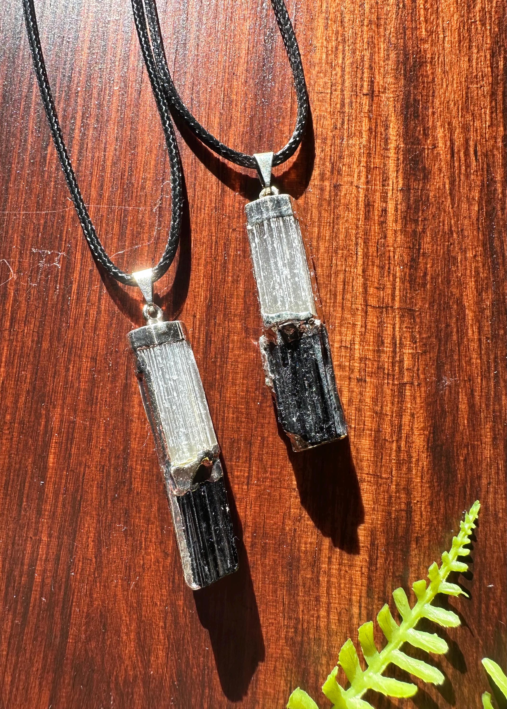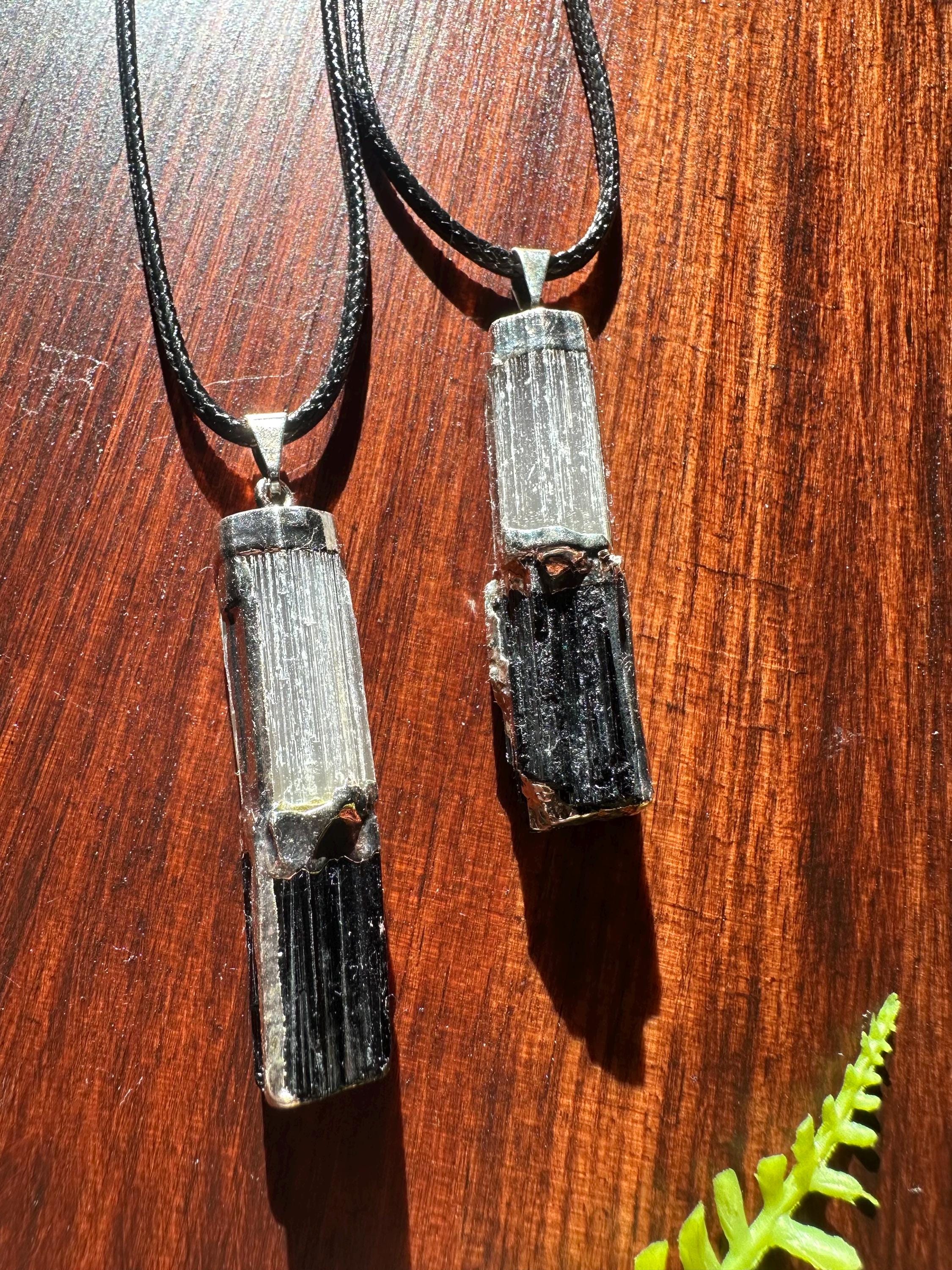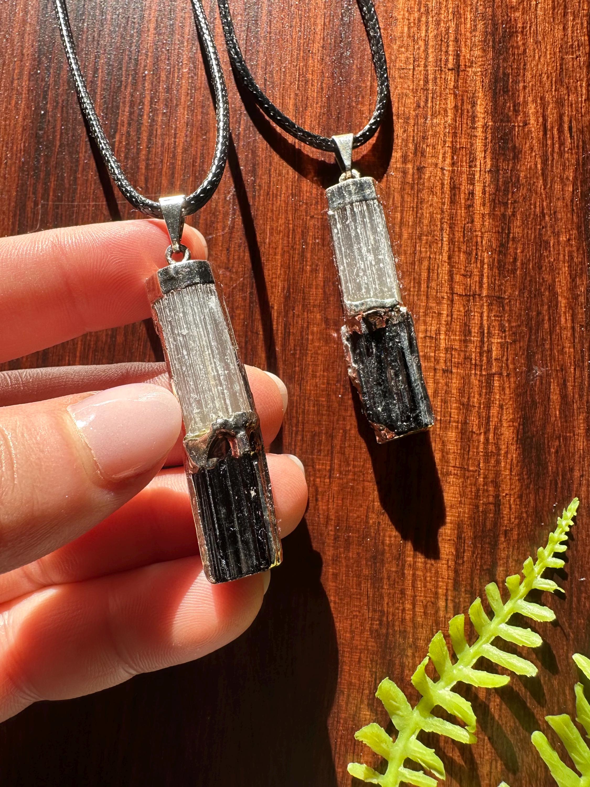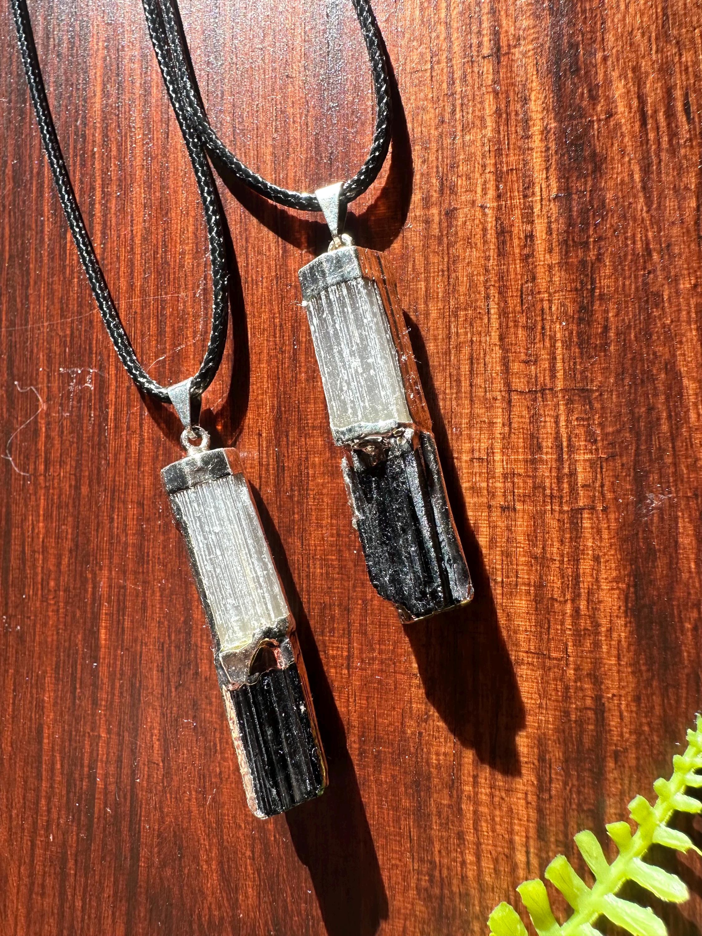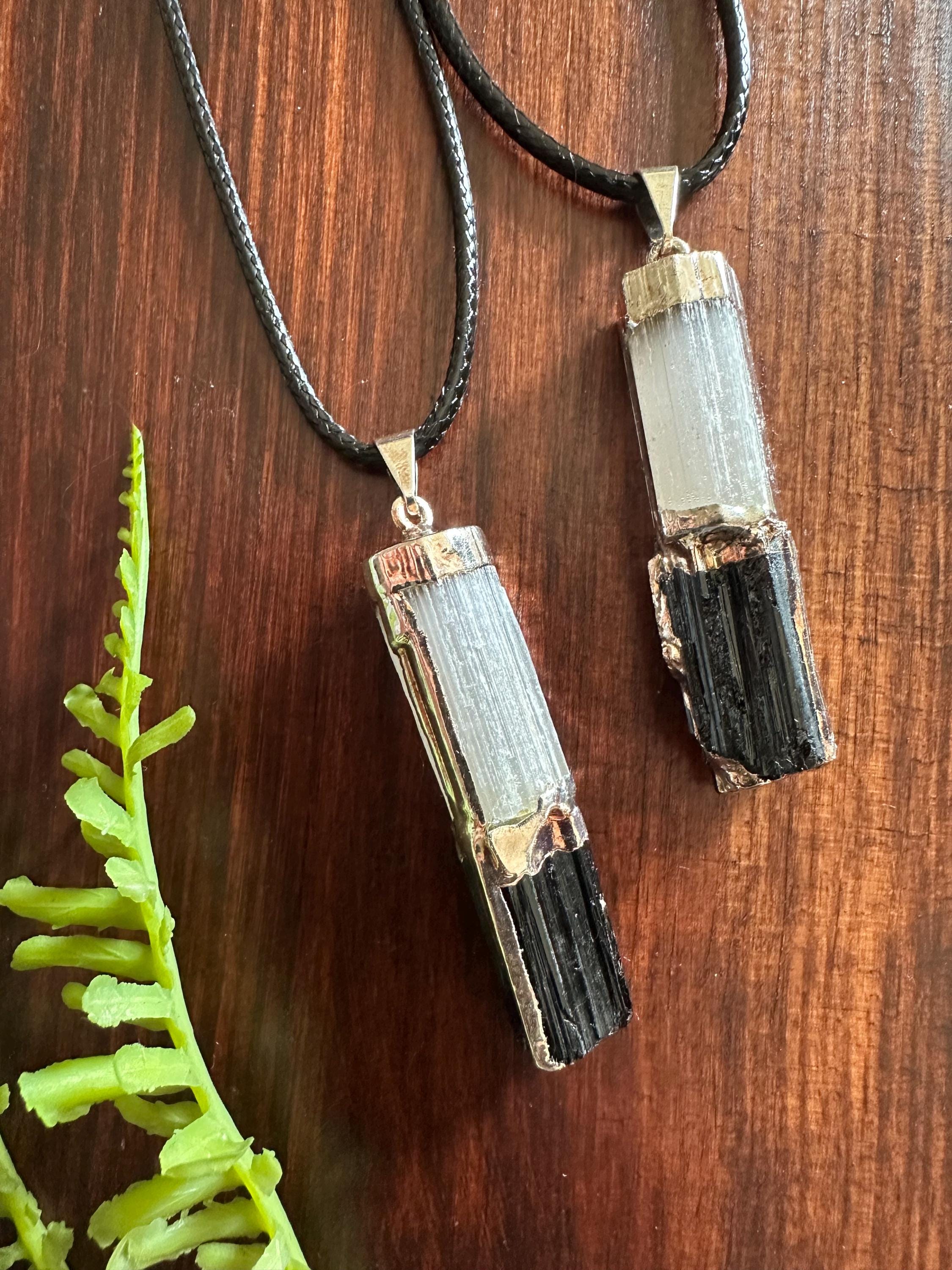 These pendants showcase two gorgeous stones that compliment each other so well, that is selenite and black tourmaline. This listing is for one individual pendant and corded necklace. You will receive one of the necklaces displayed in the photos shown. The pendant is slightly over 1.5 inches long.