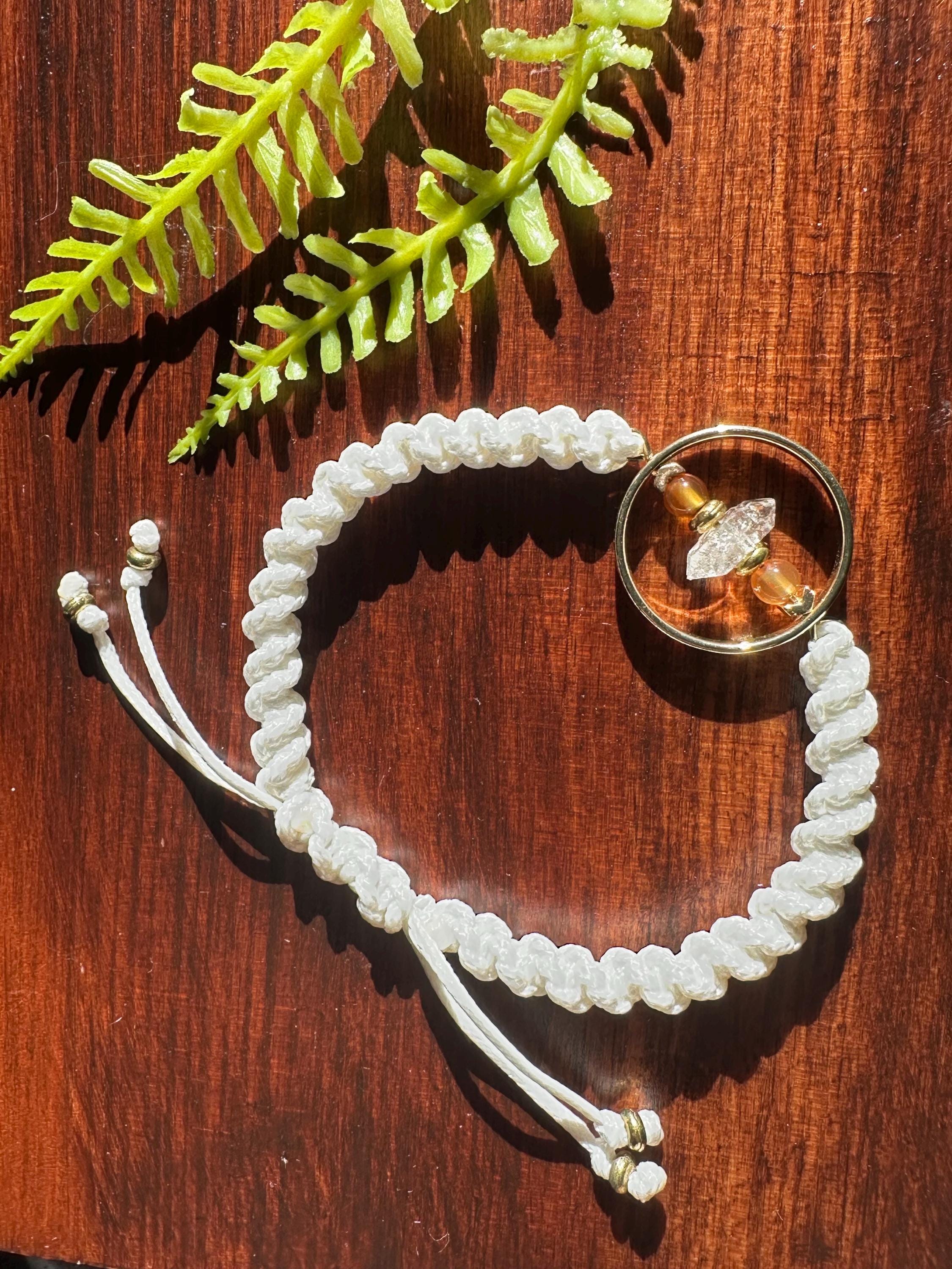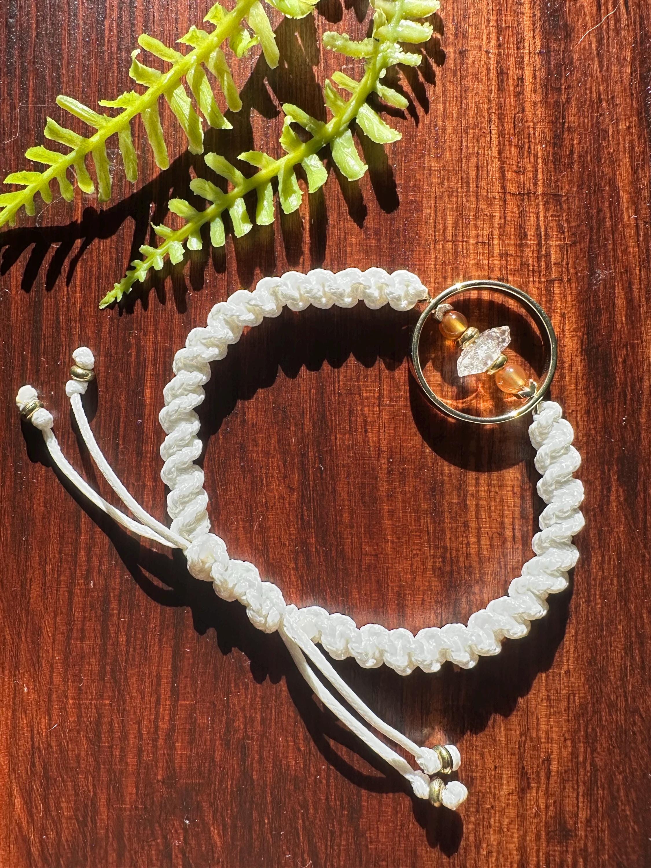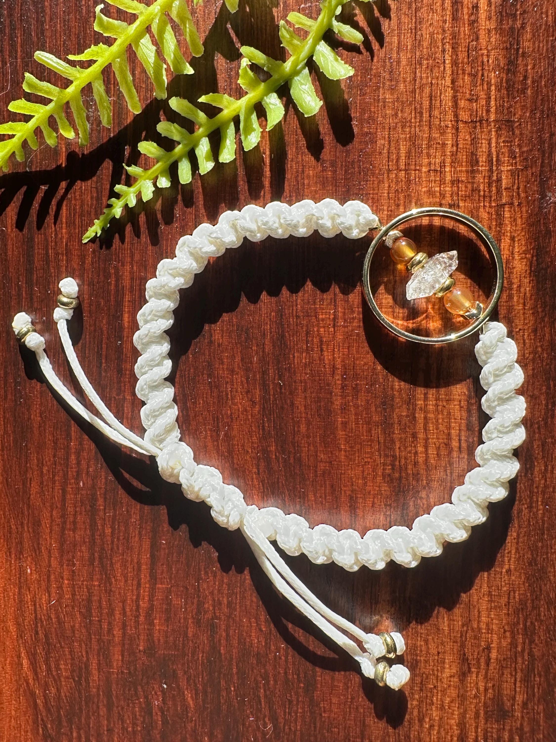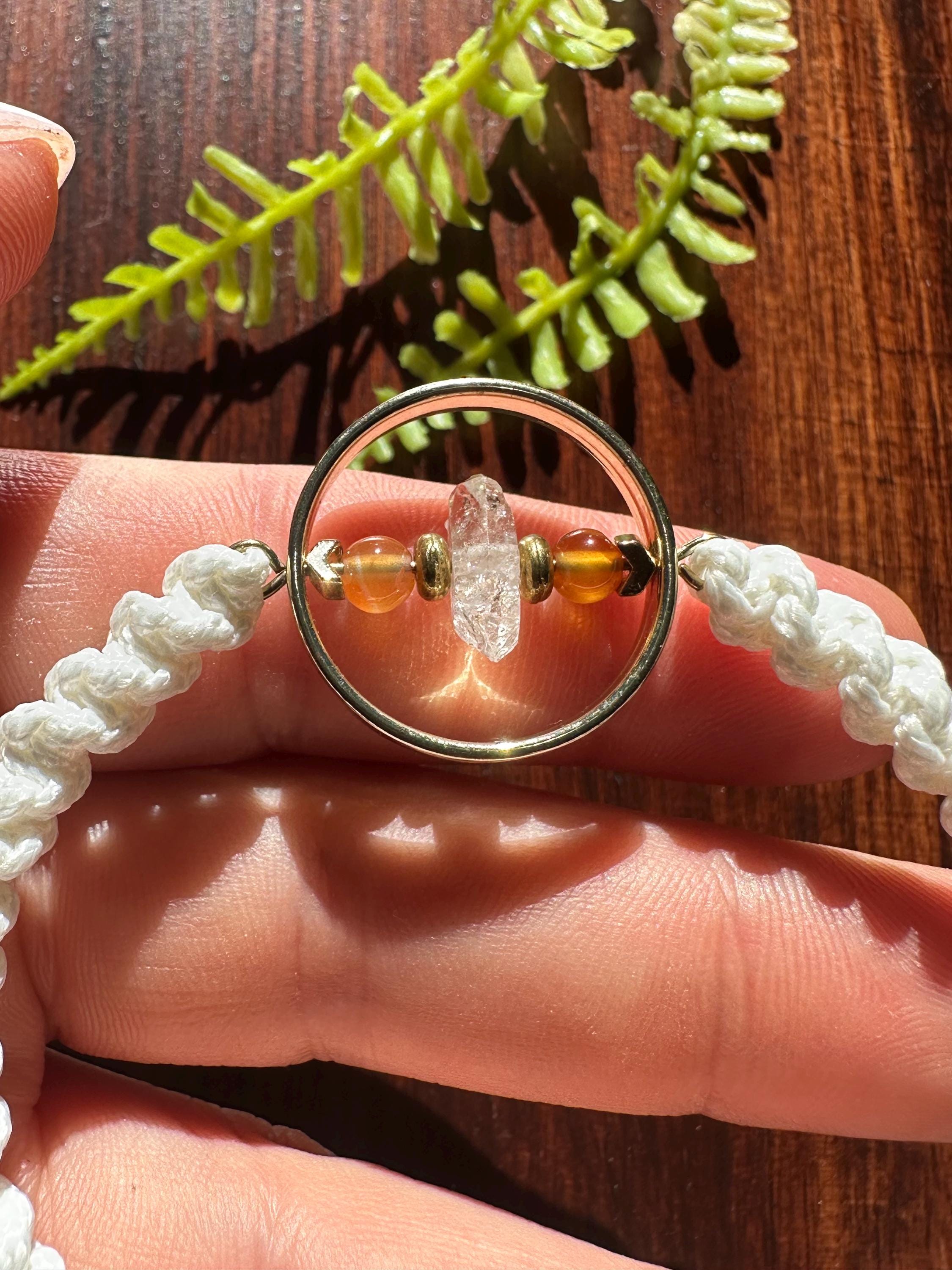This beautiful hand woven white corded bracelet features a focal point of herkimer diamond and carnelian agate with gold accents.