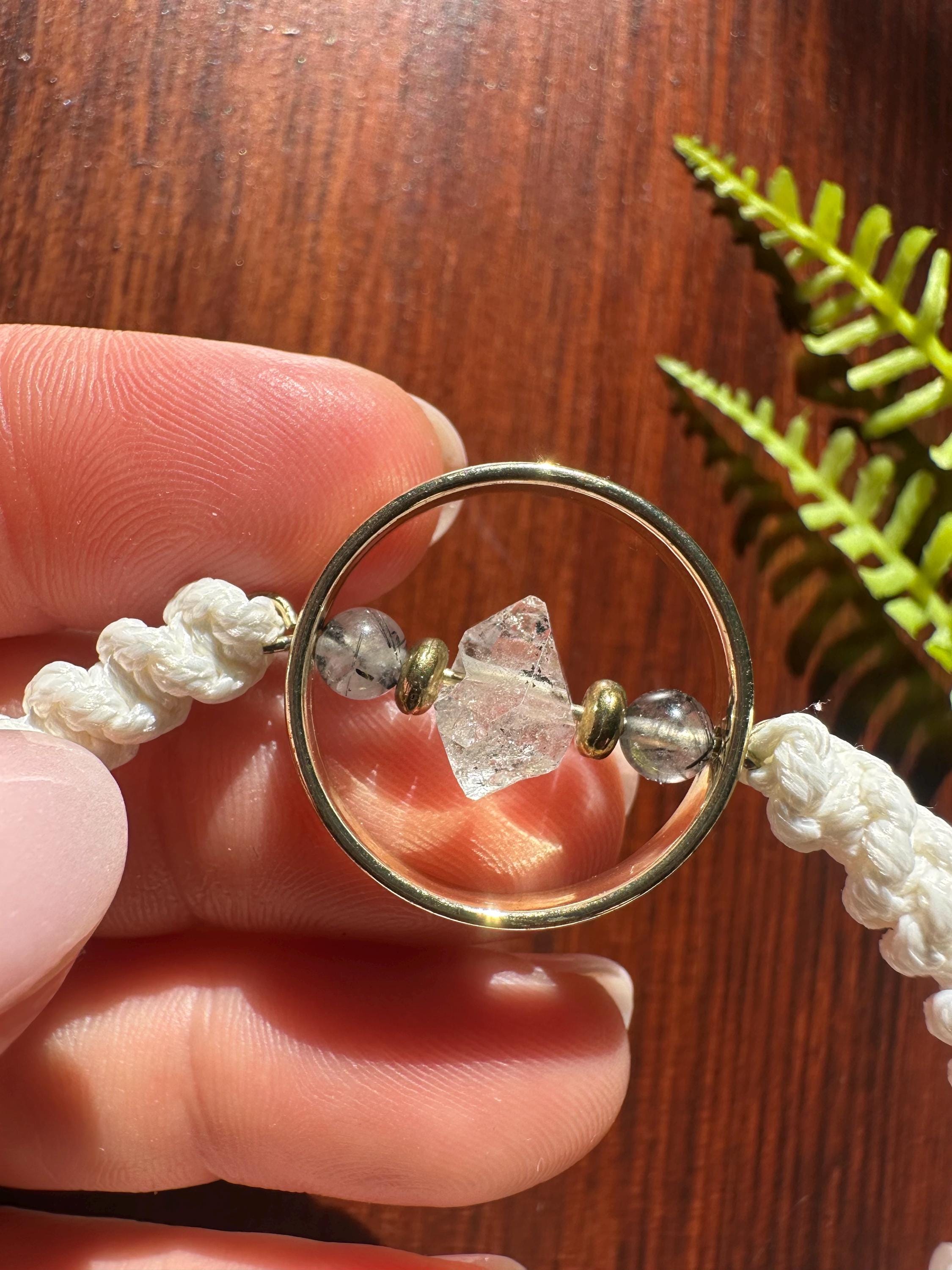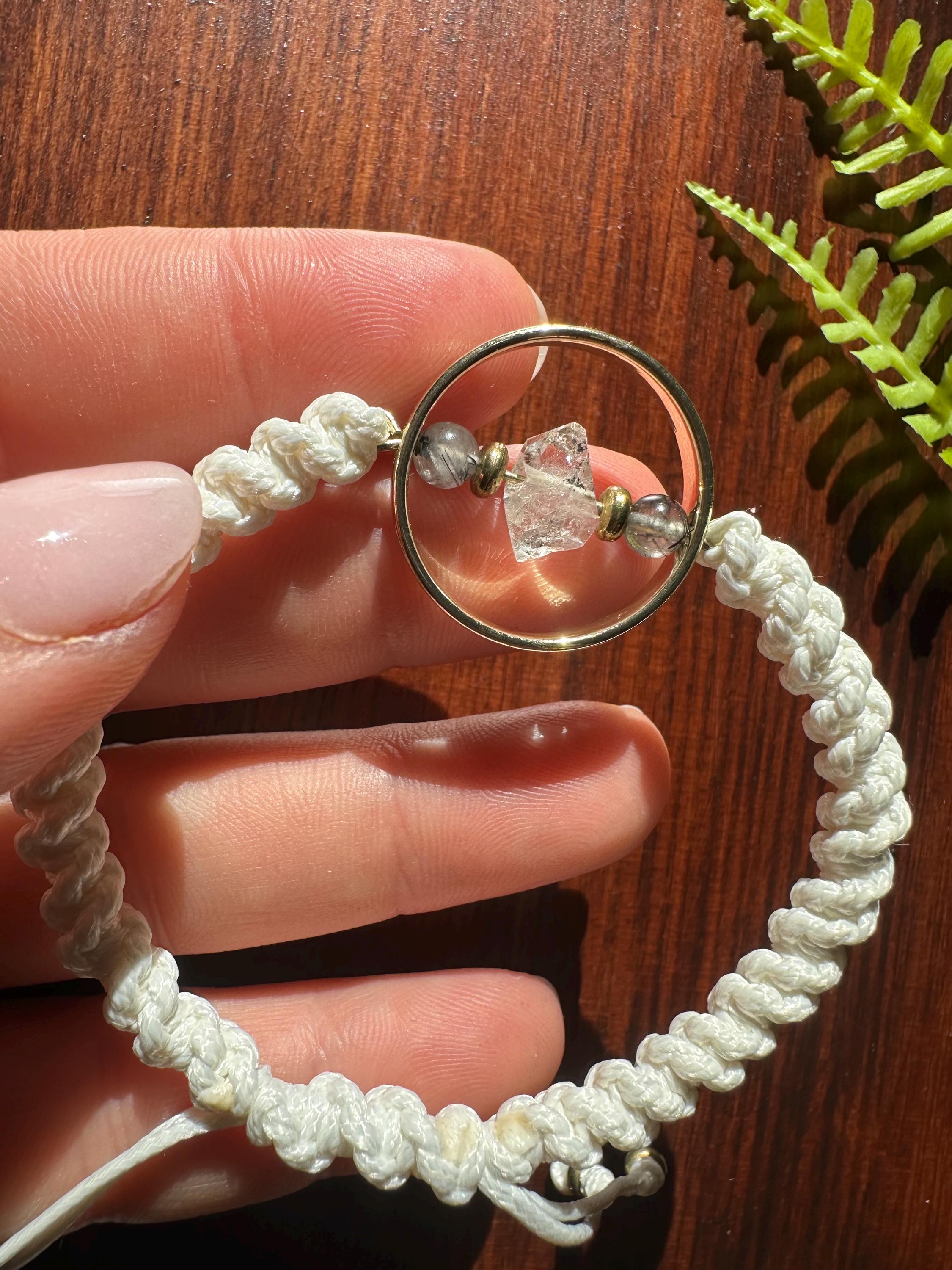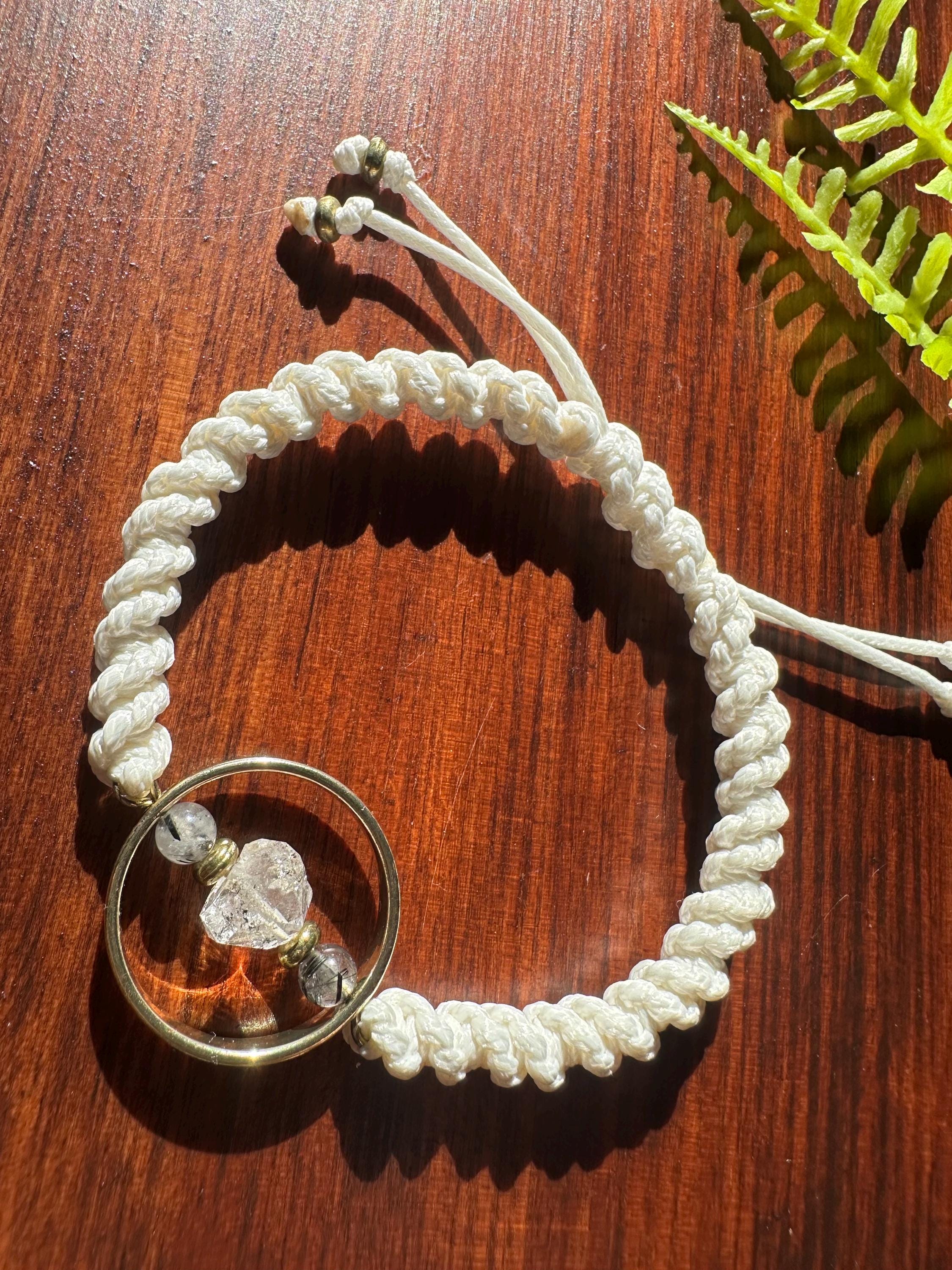 This beautiful hand woven white corded bracelet features a focal point of herkimer diamond and tourmalinated quartz with gold accents.