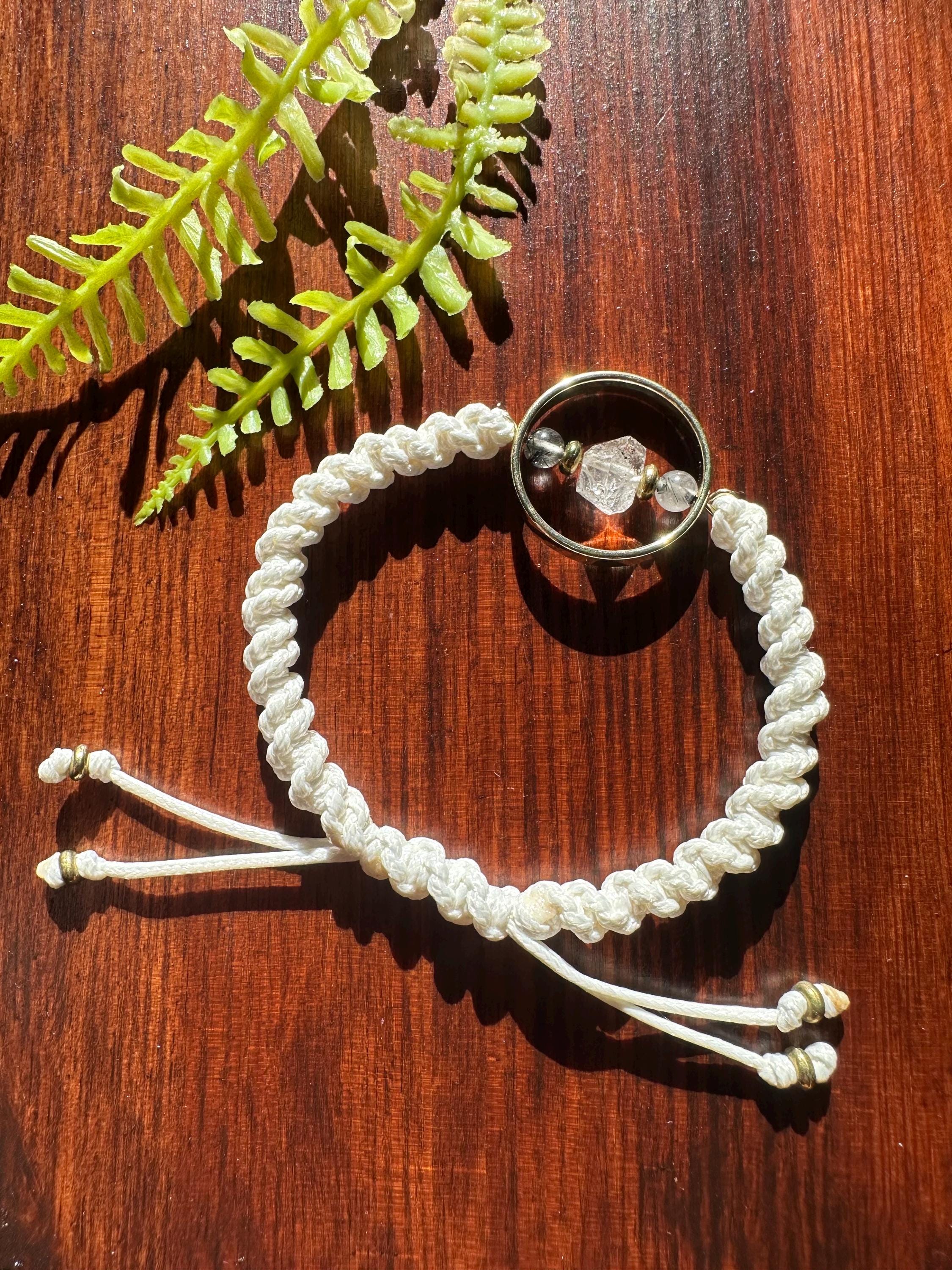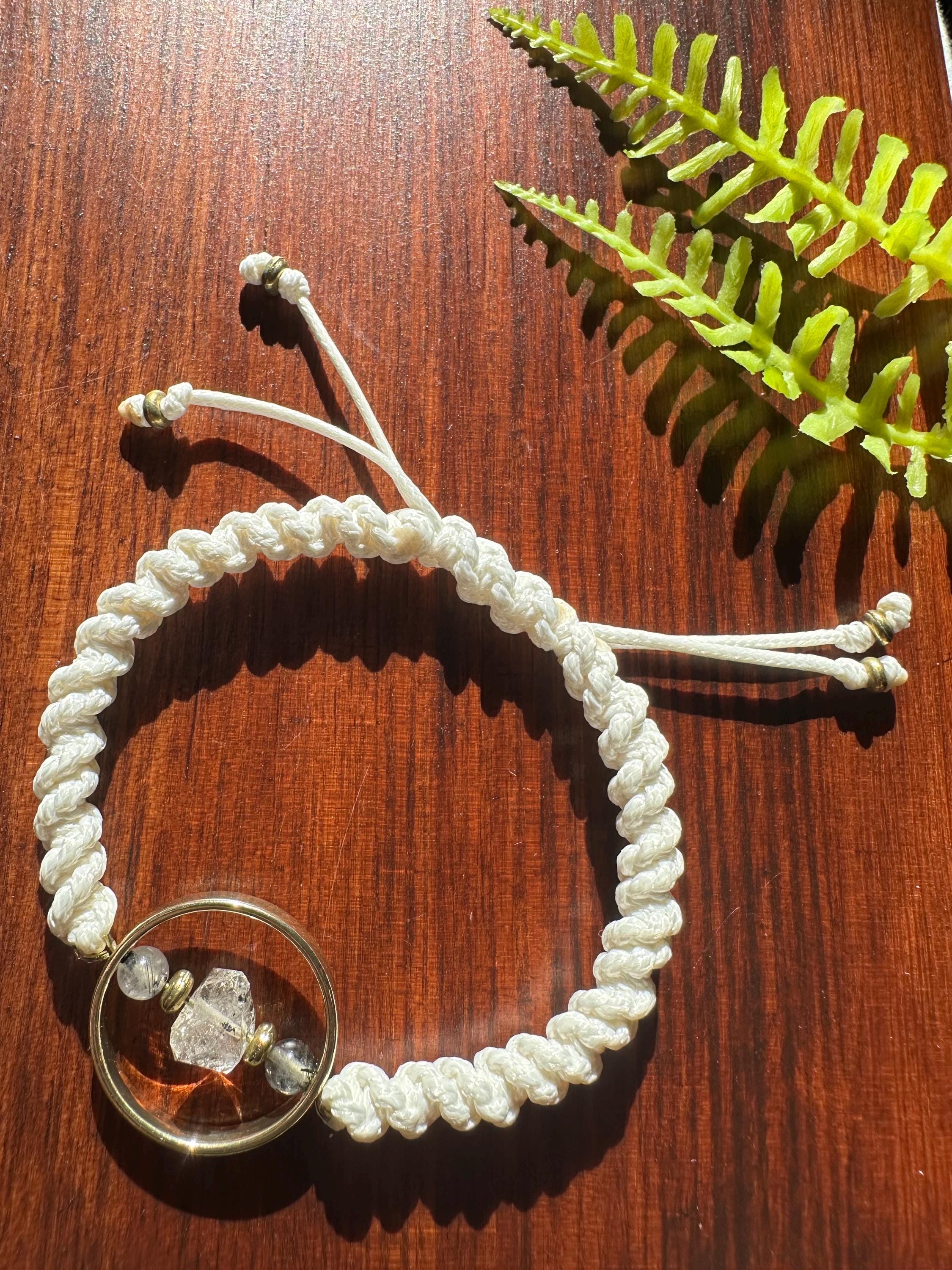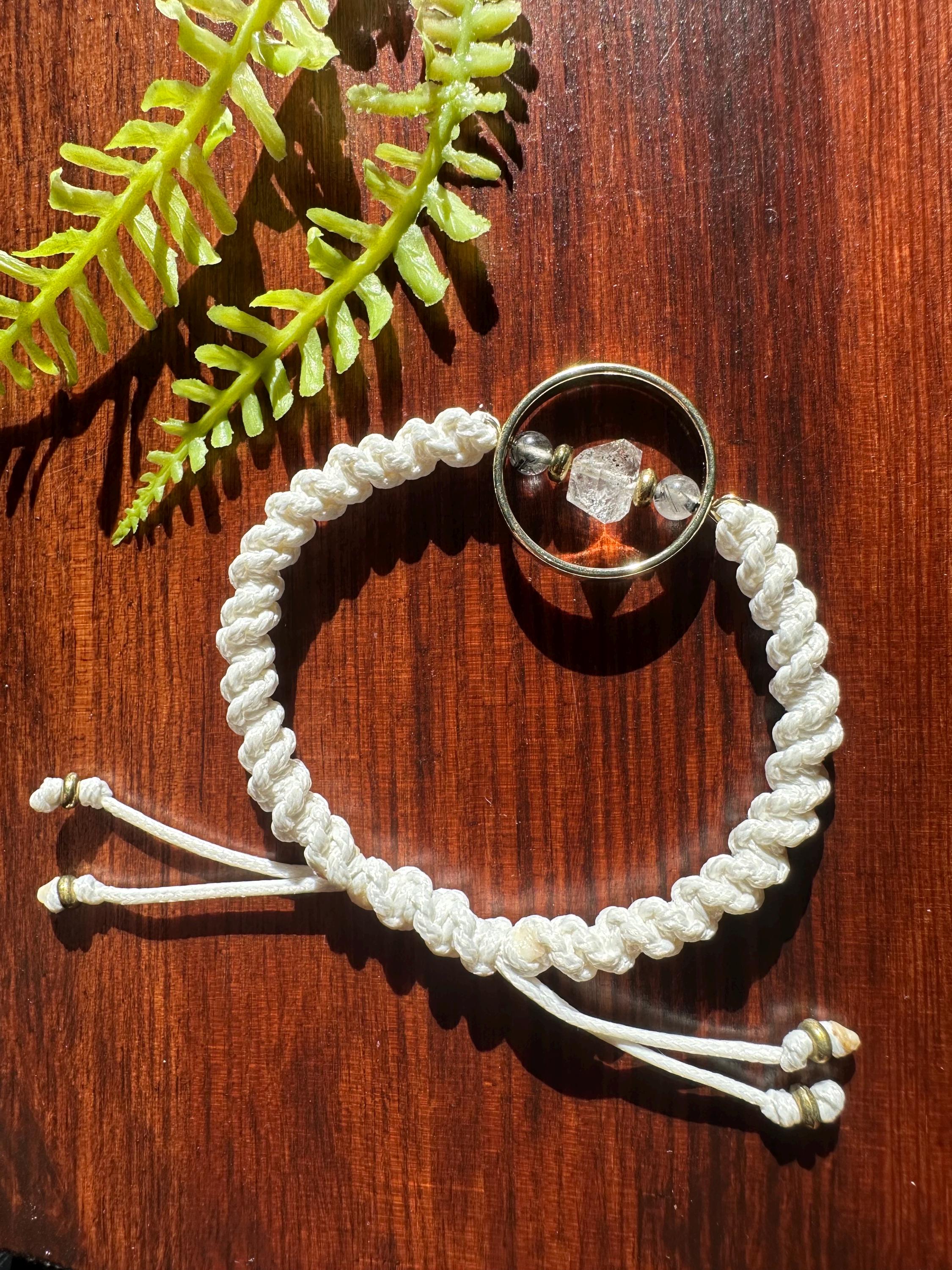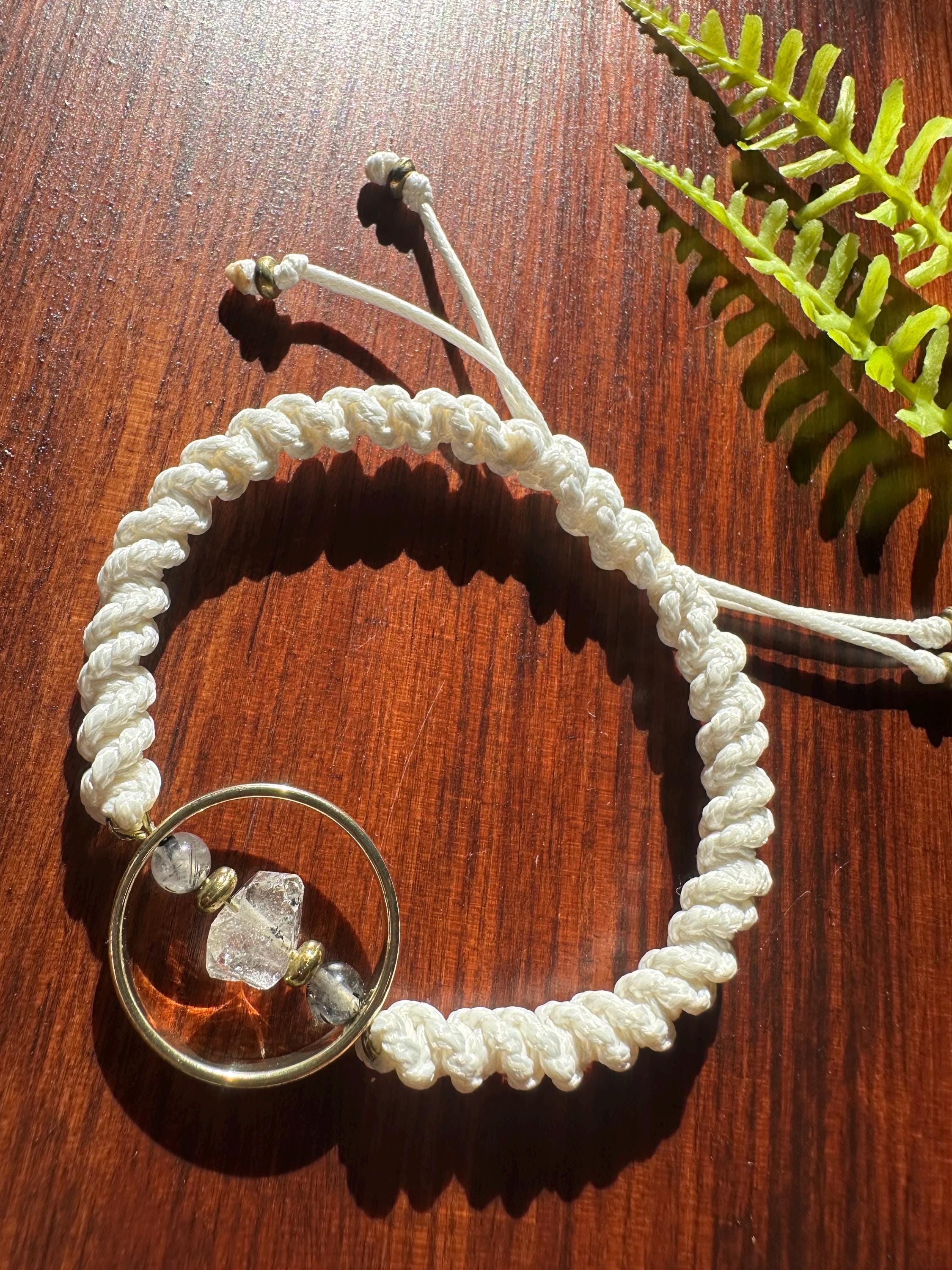 This beautiful hand woven white corded bracelet features a focal point of herkimer diamond and tourmalinated quartz with gold accents.