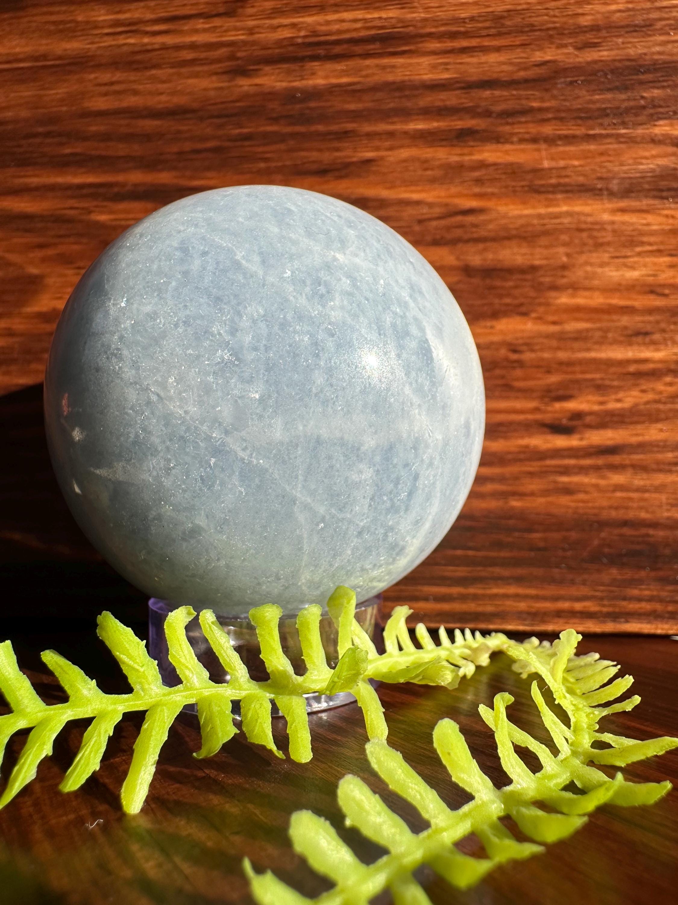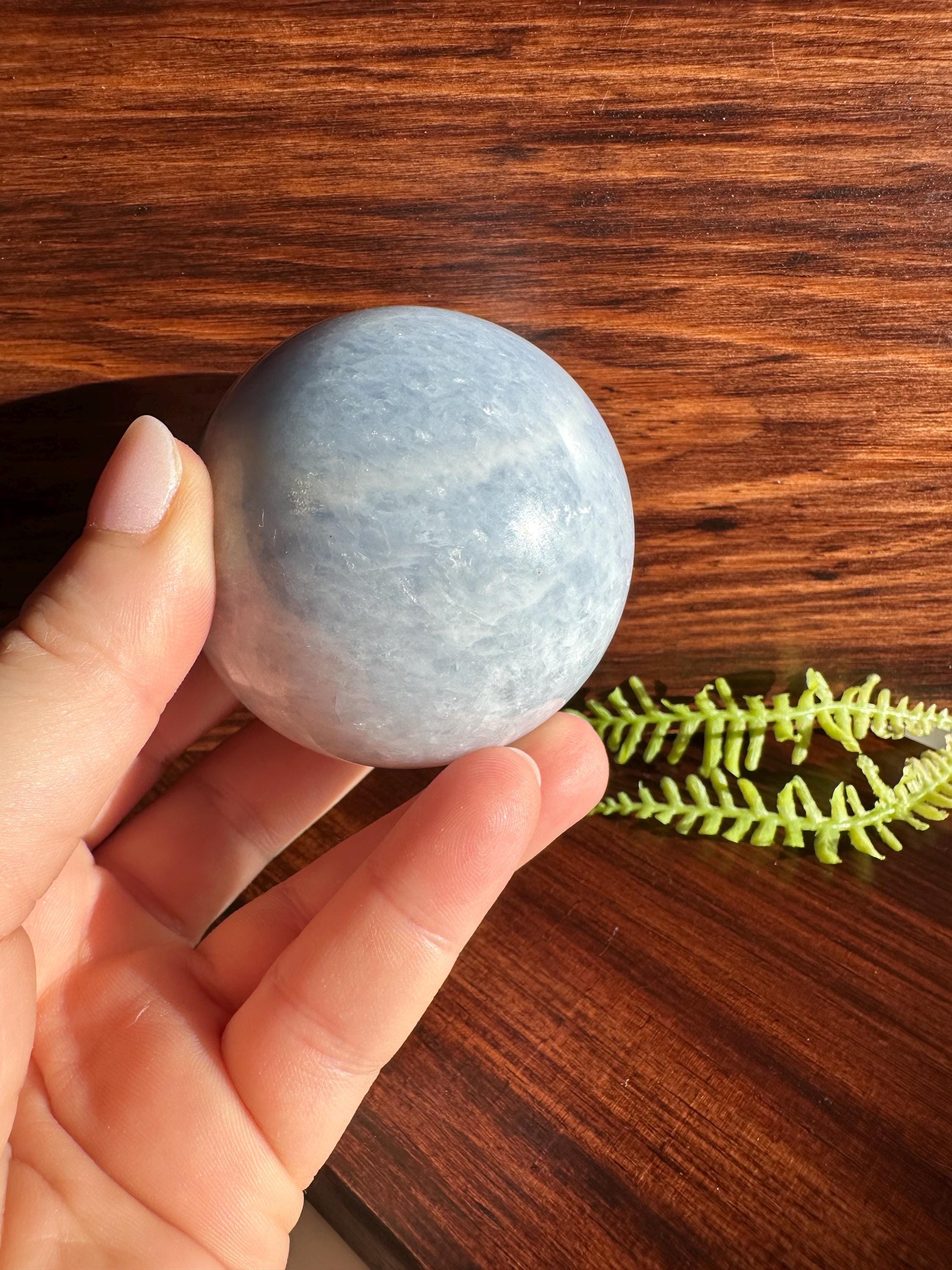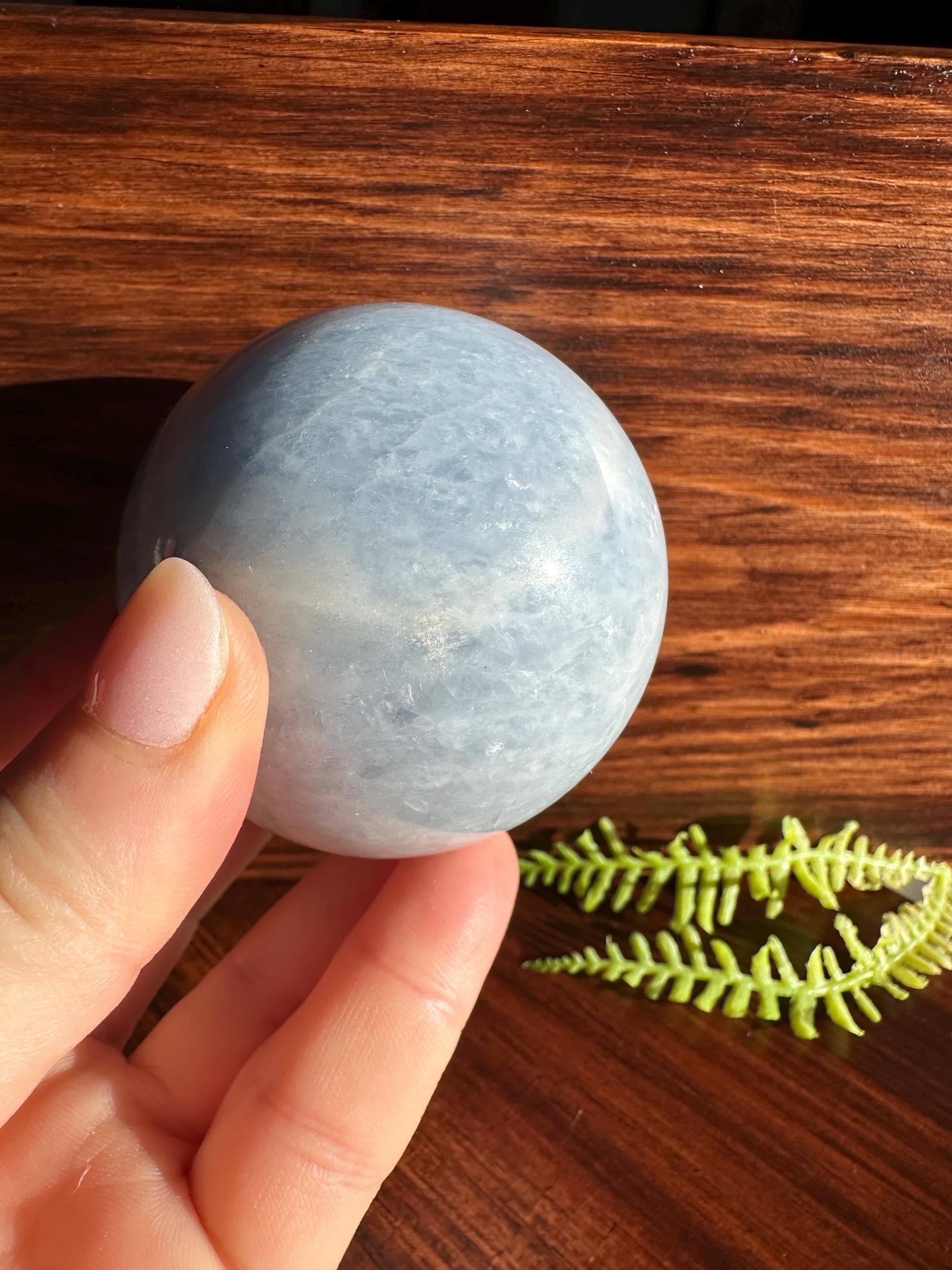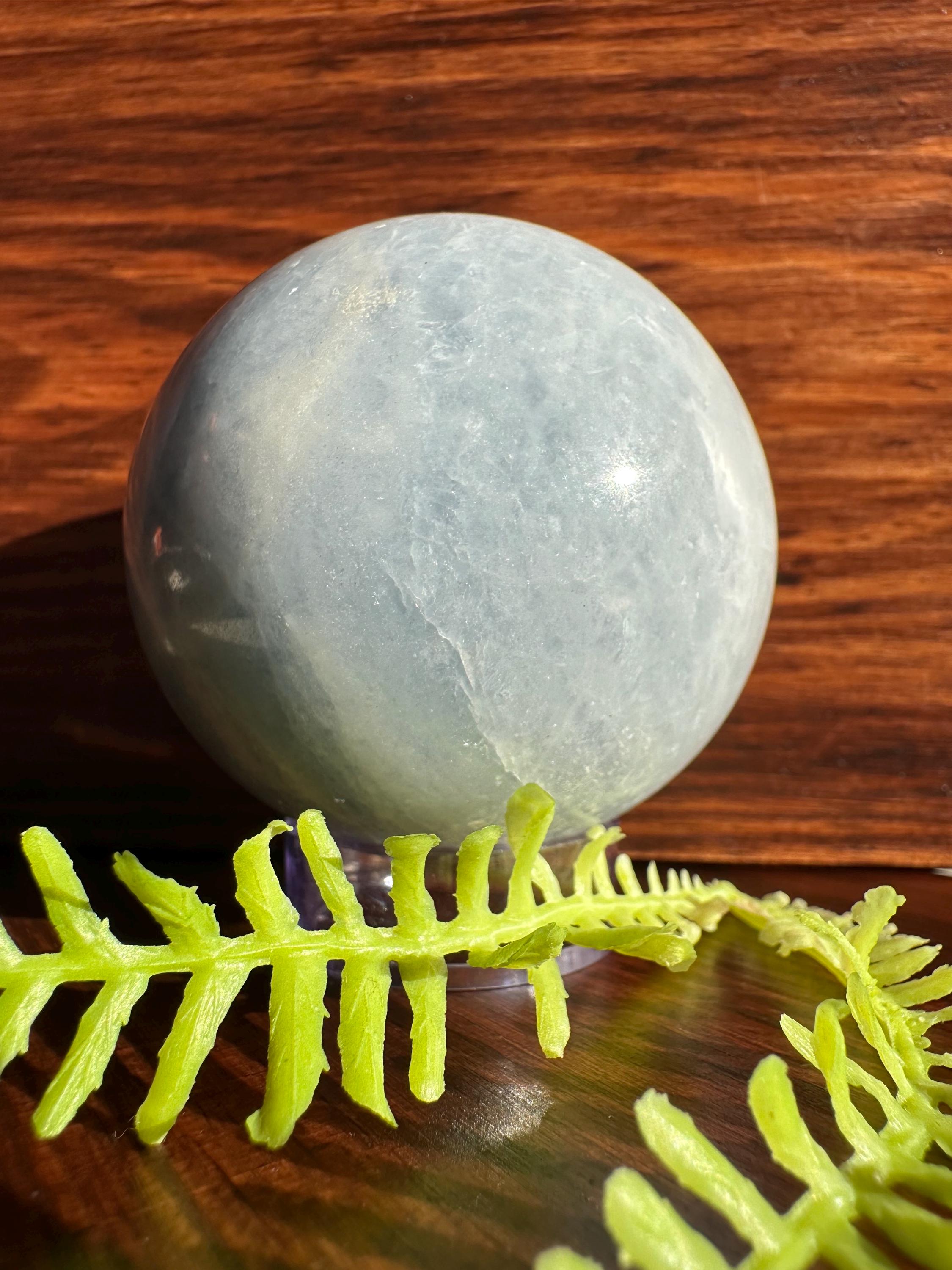 A beautiful blue calcite polished sphere that weighs roughly 300g.
