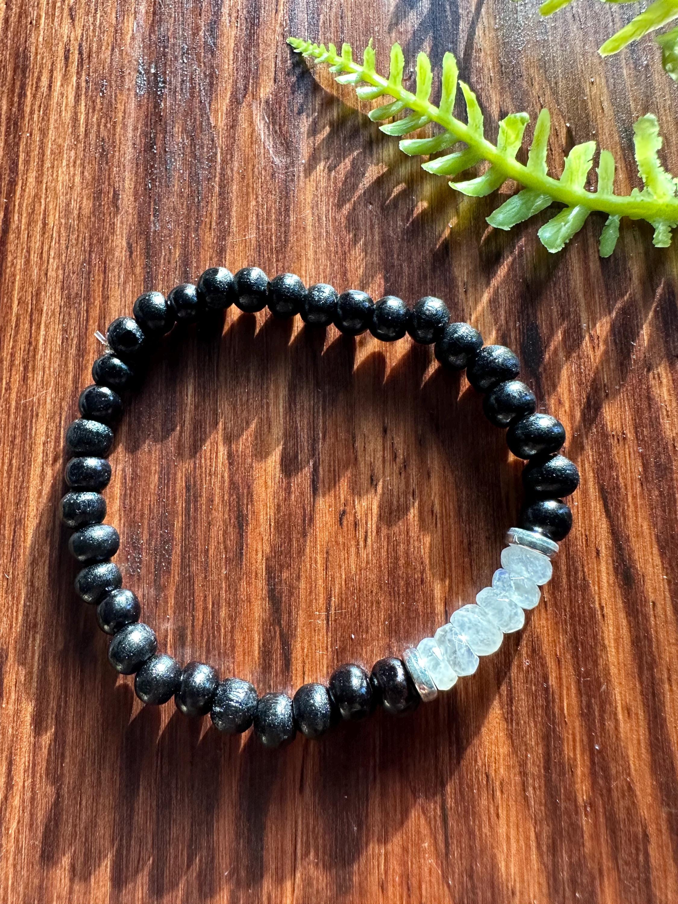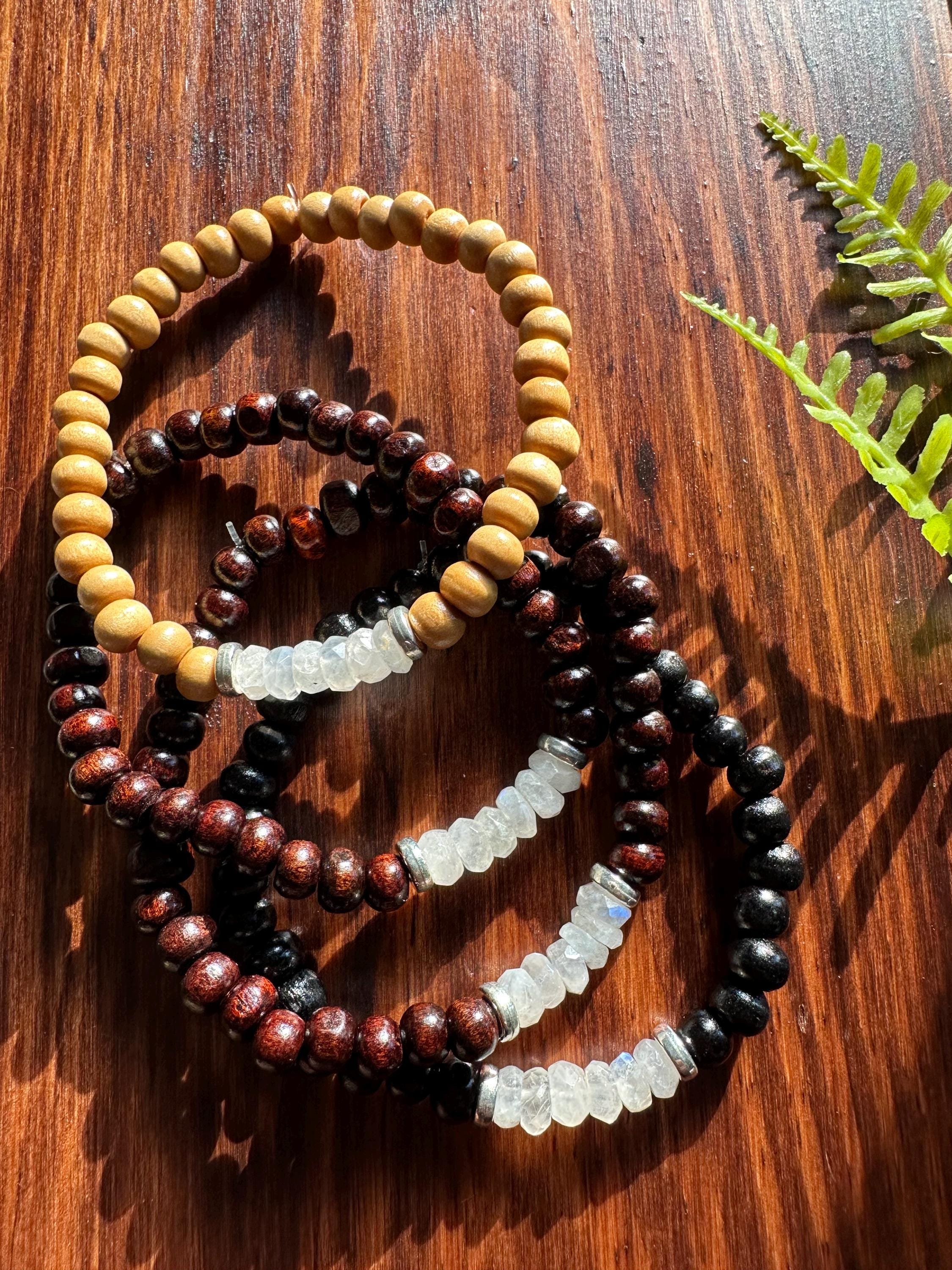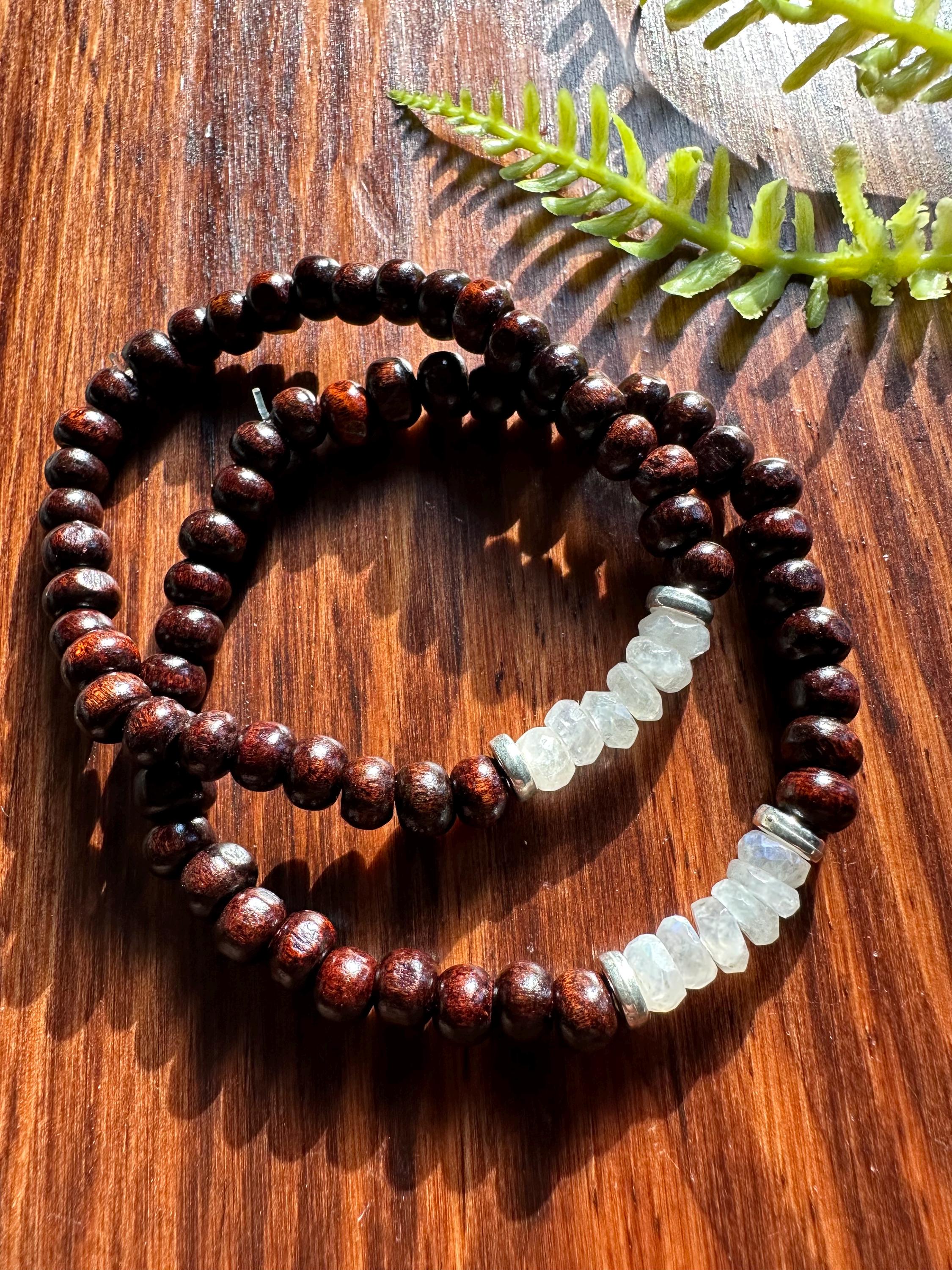 Natural faceted rainbow moonstone creates the focal point of this bracelet. I have multiple wood bead options available, so please be sure to select the desired hue when adding to your cart.