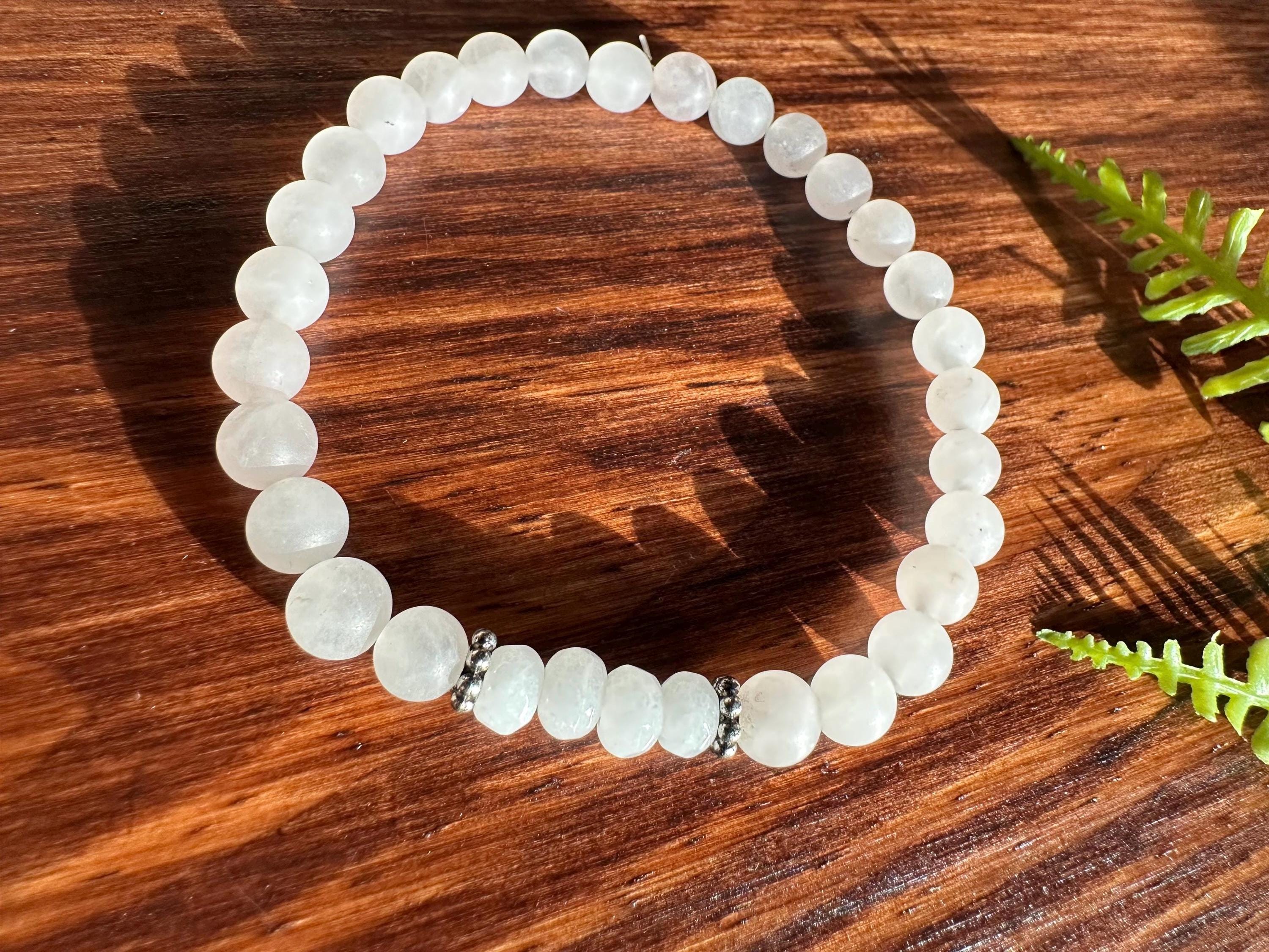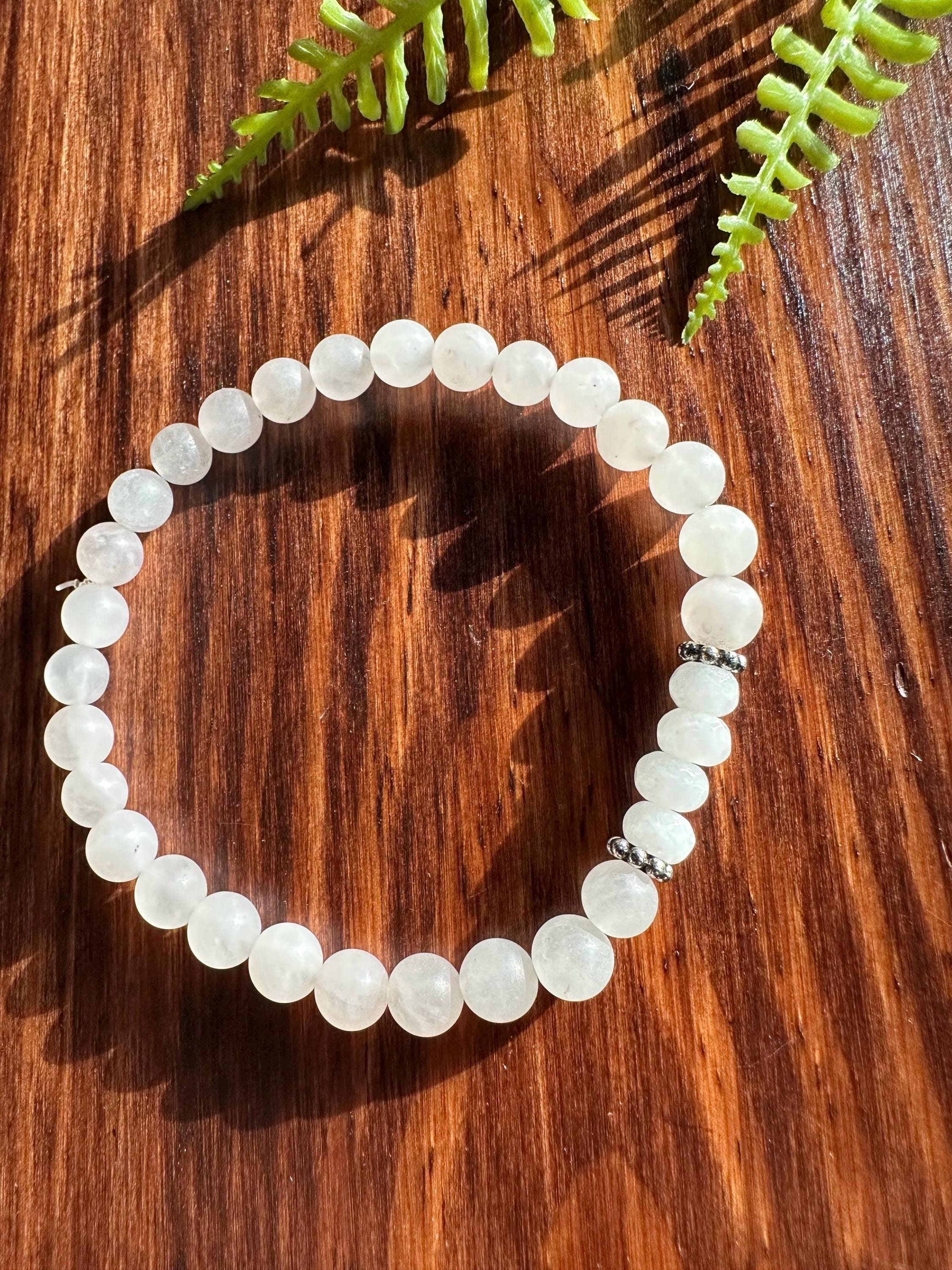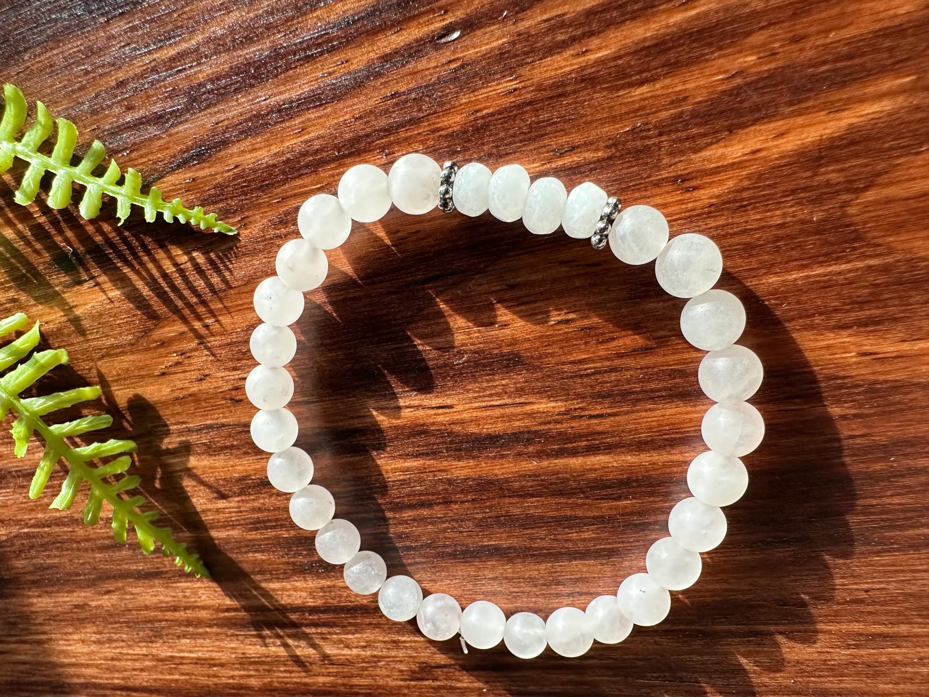 The centerpiece of this bracelet features 6mm faceted white jade beads with rose quartz accent beads.