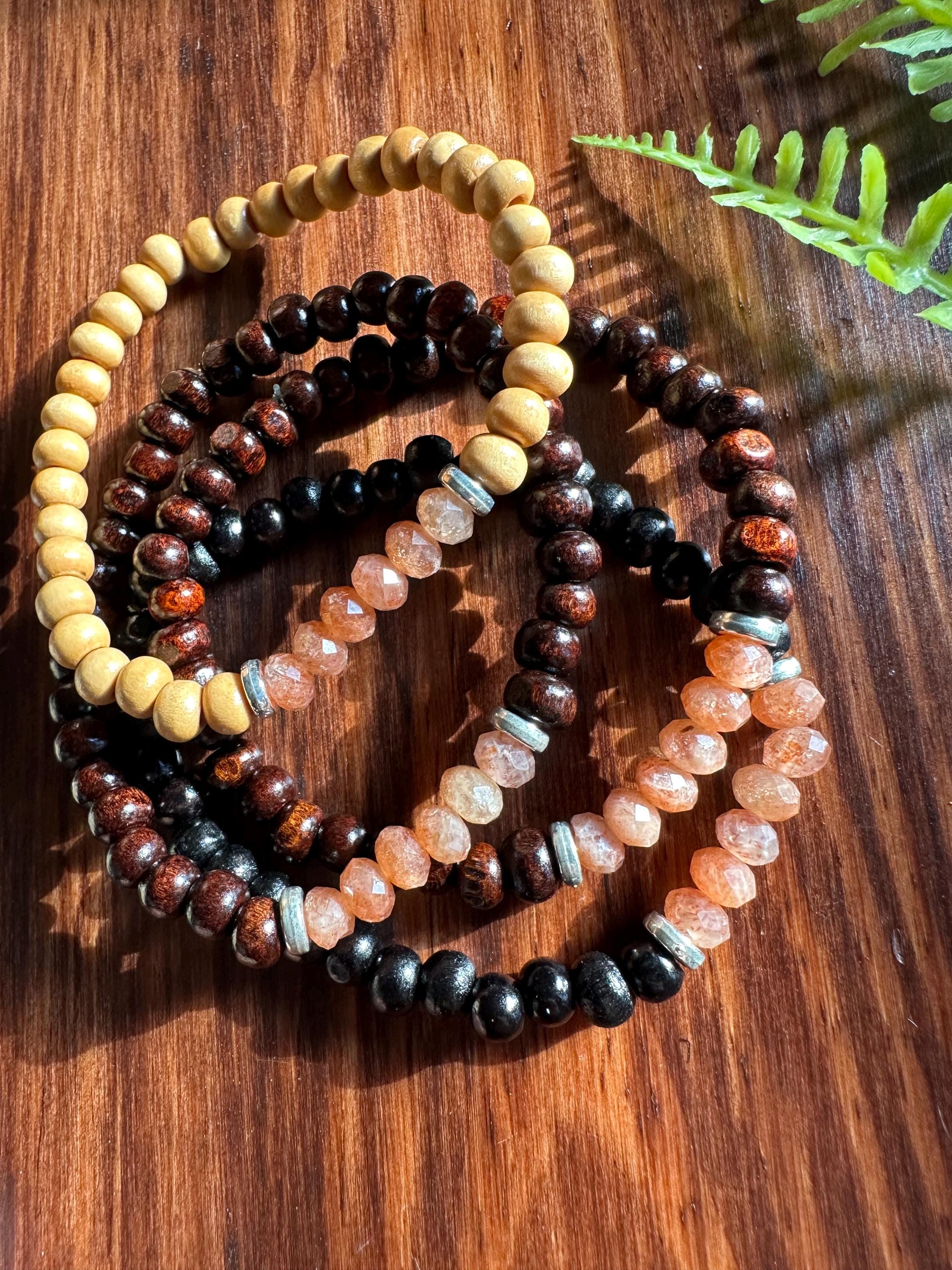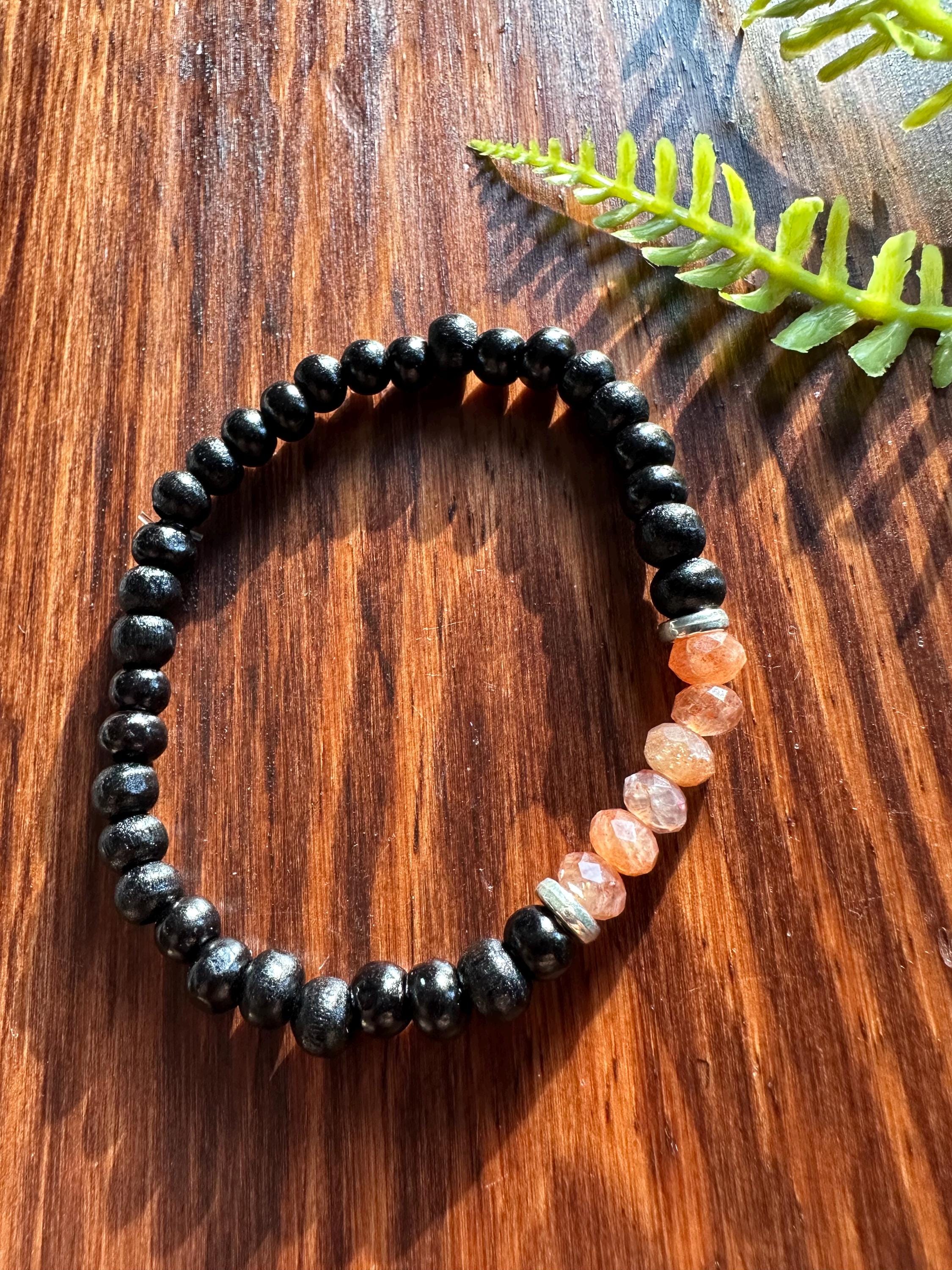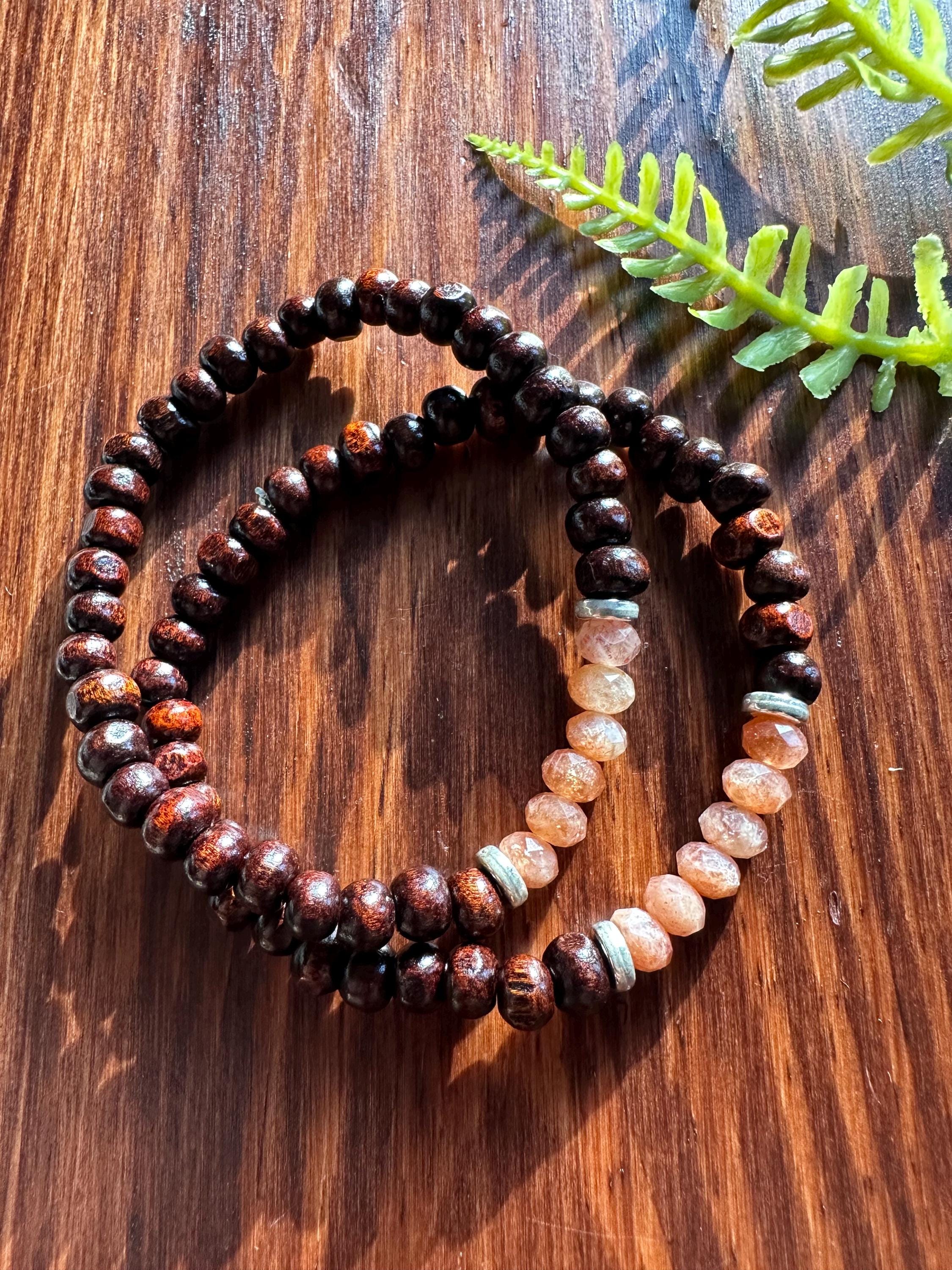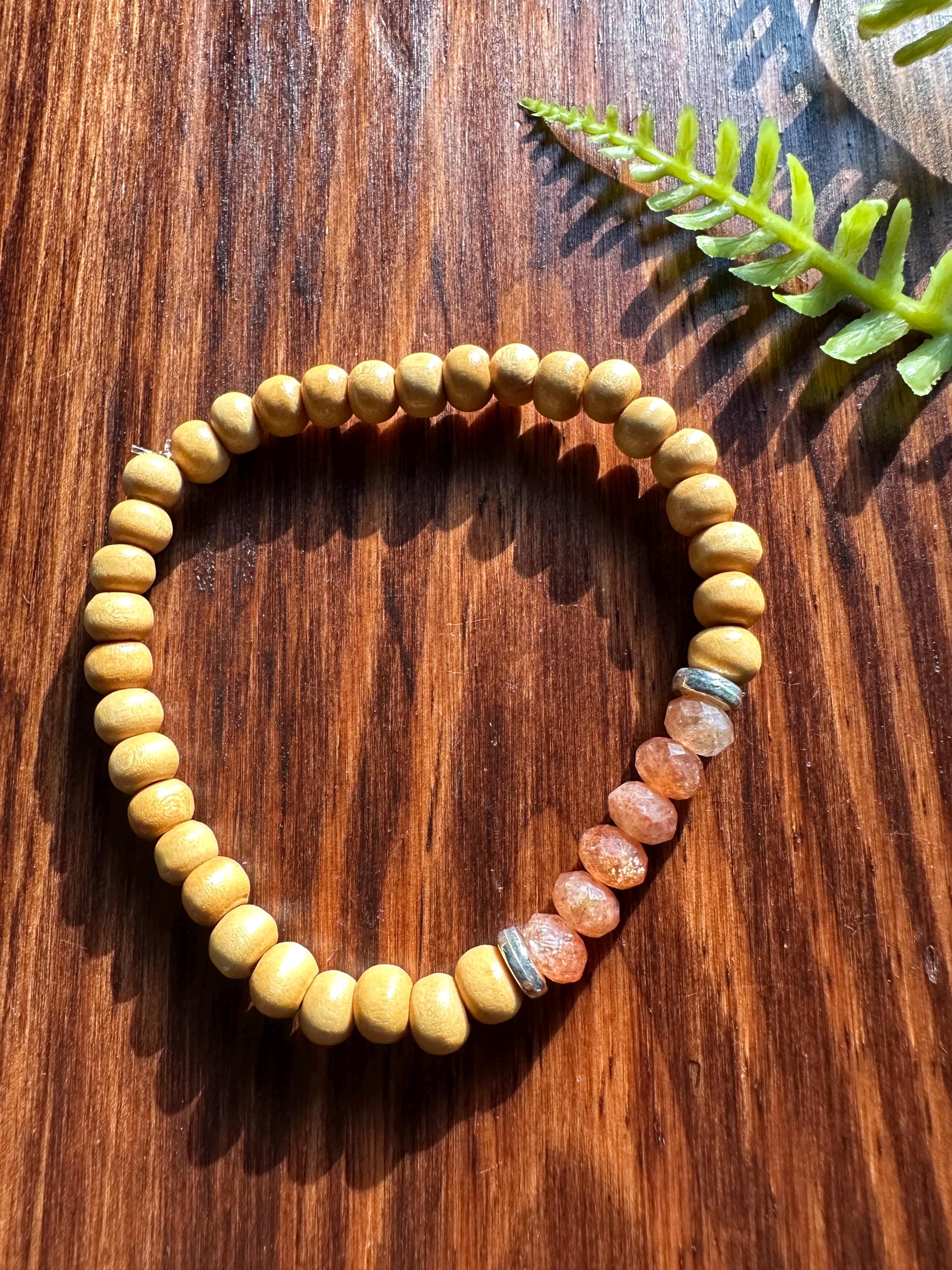 Natural faceted sunstone creates the focal point of this bracelet. I have multiple wood bead options available, so please be sure to select the desired hue when adding to your cart.