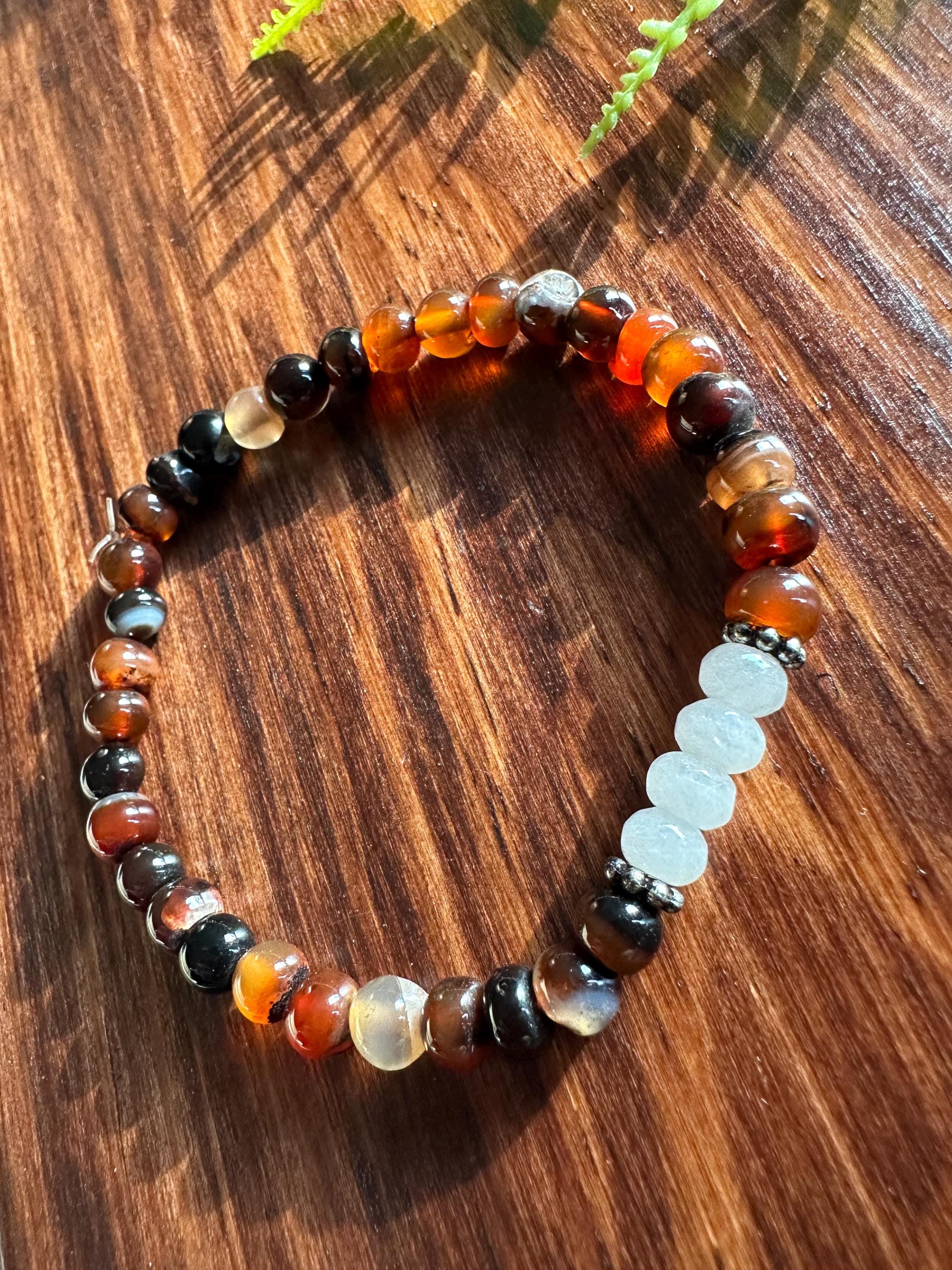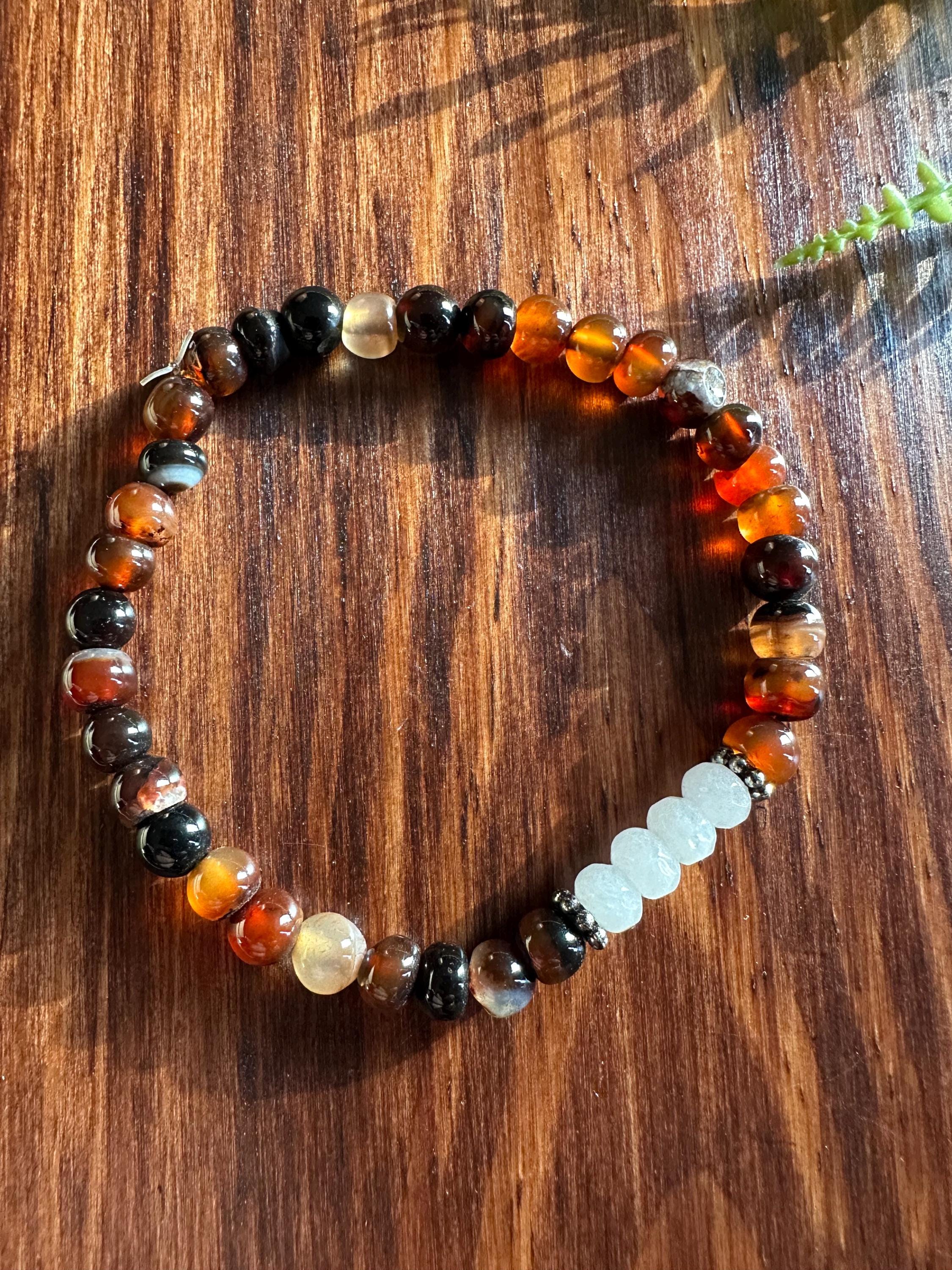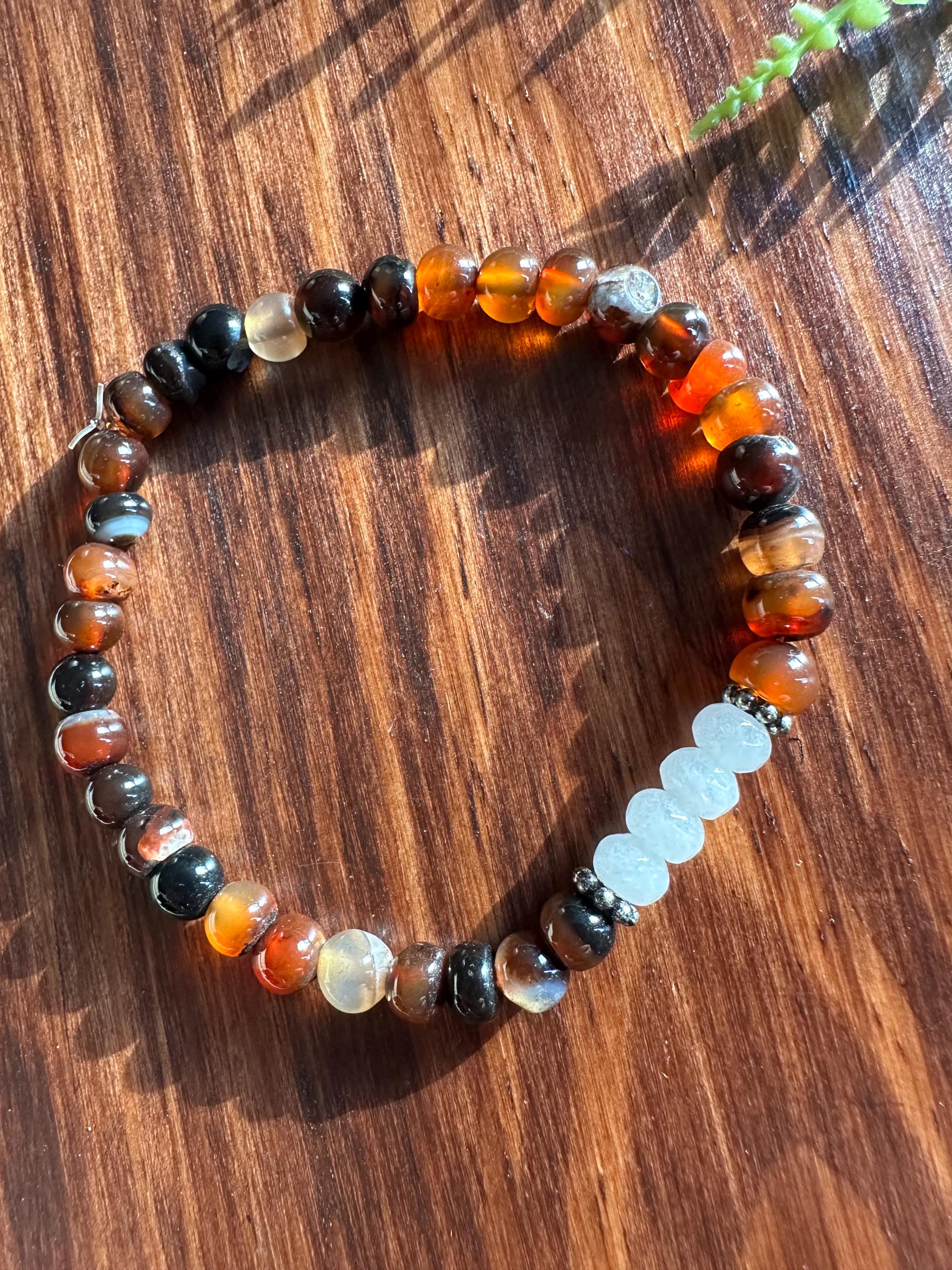 The centerpiece of this bracelet features 6mm faceted white jade beads with red/black agate accent beads.