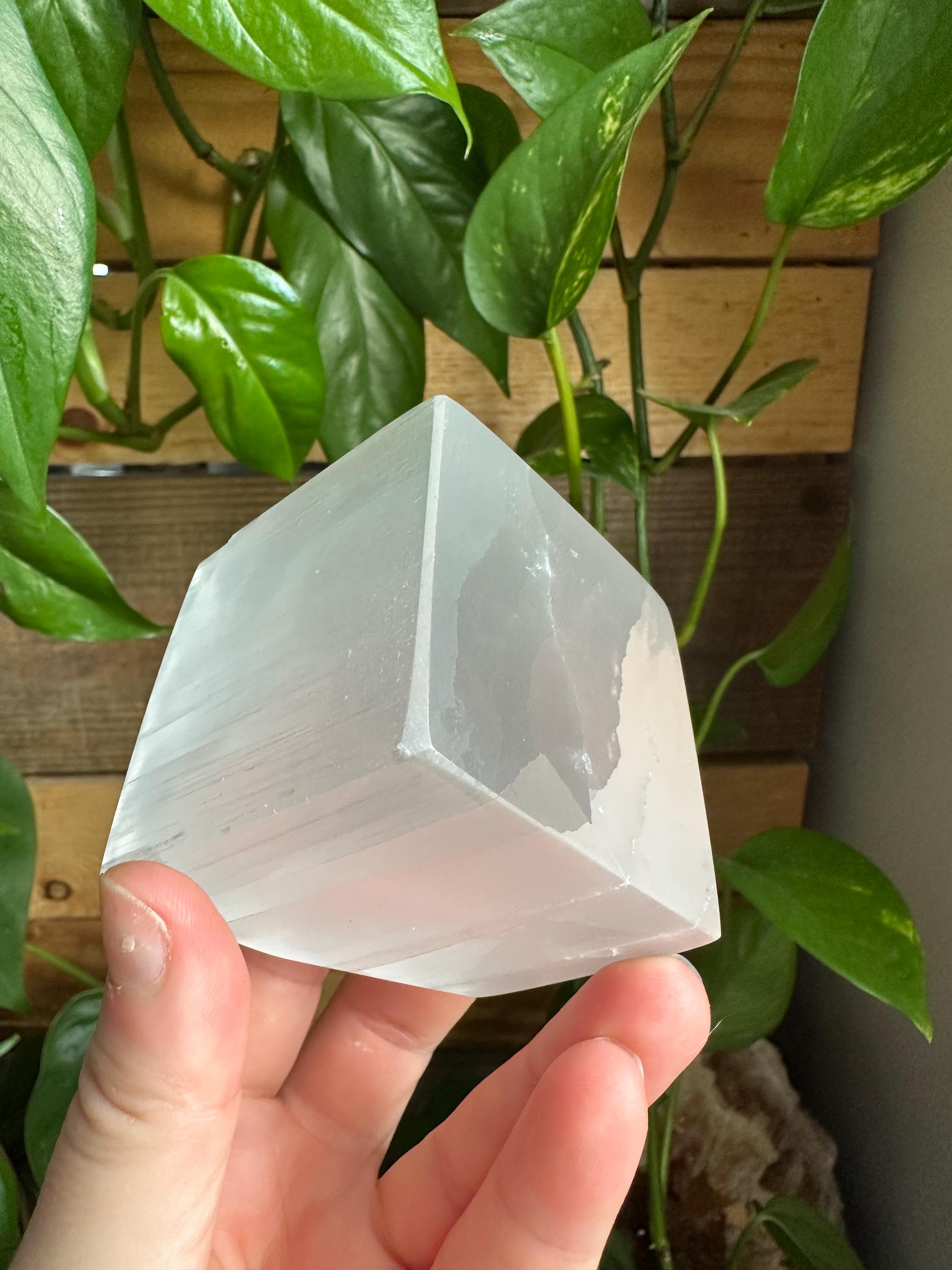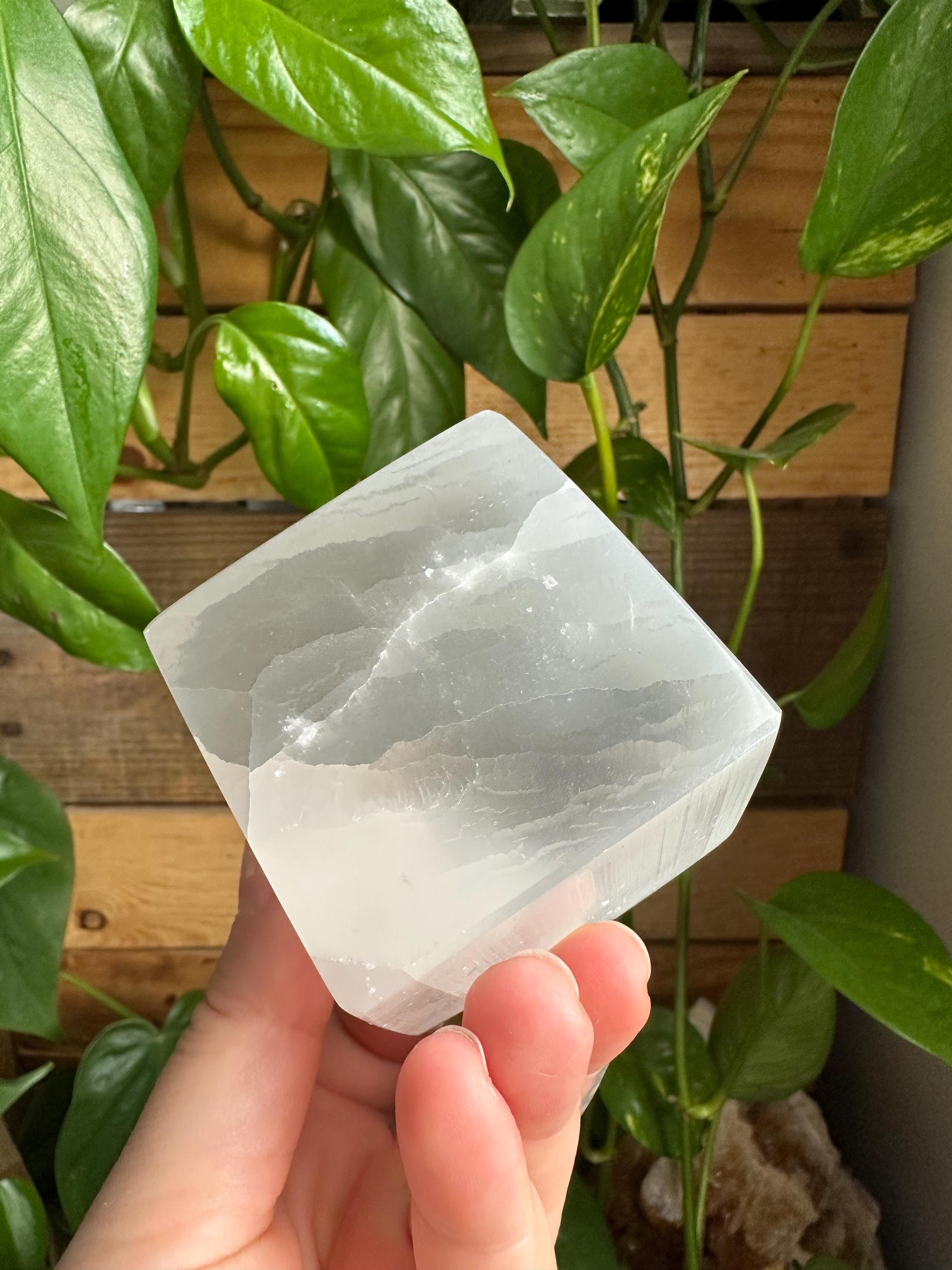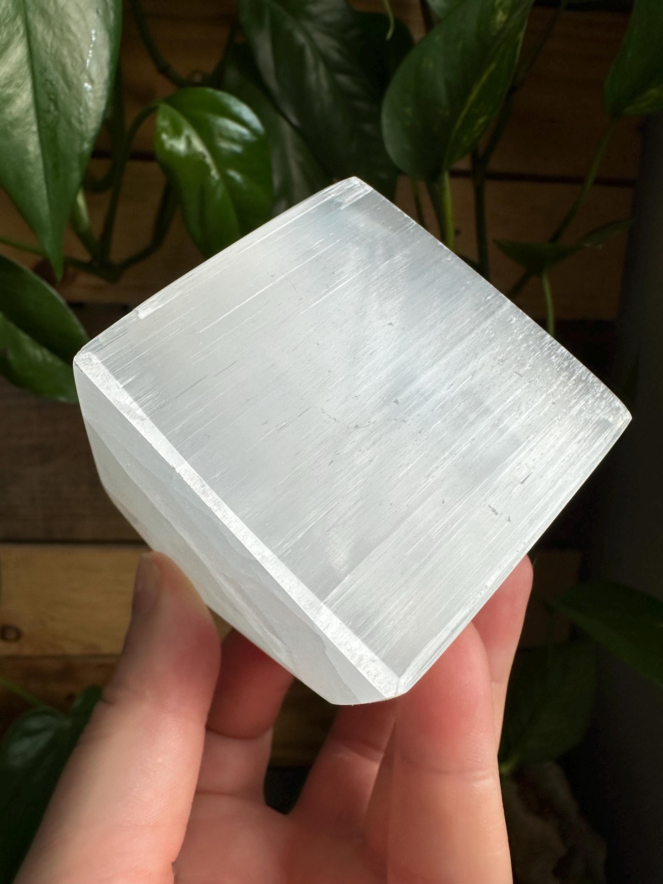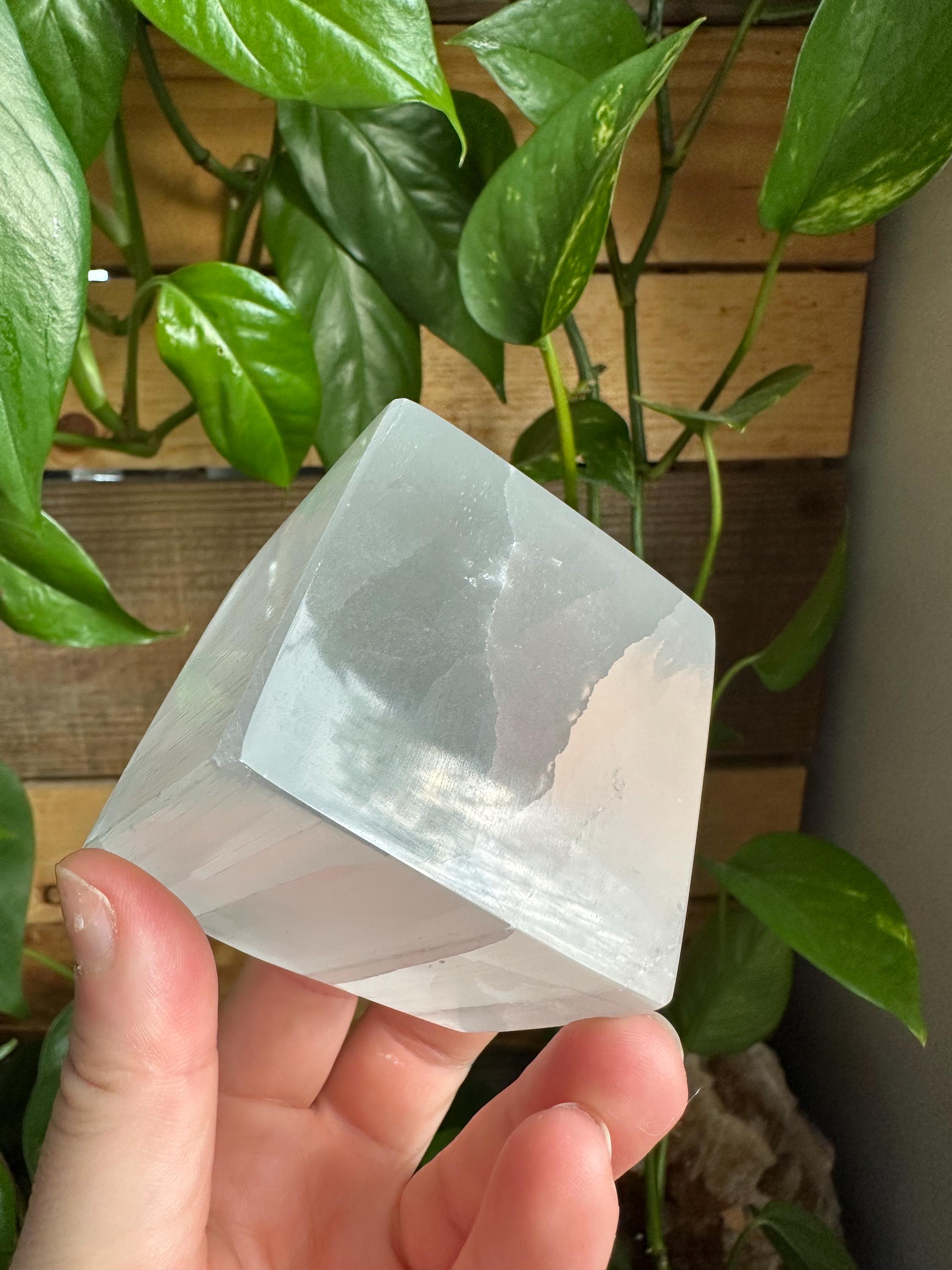 Cool selenite cube. This cube is slightly notched on one corner and can be displayed on the notch if desired, giving it an angled display.