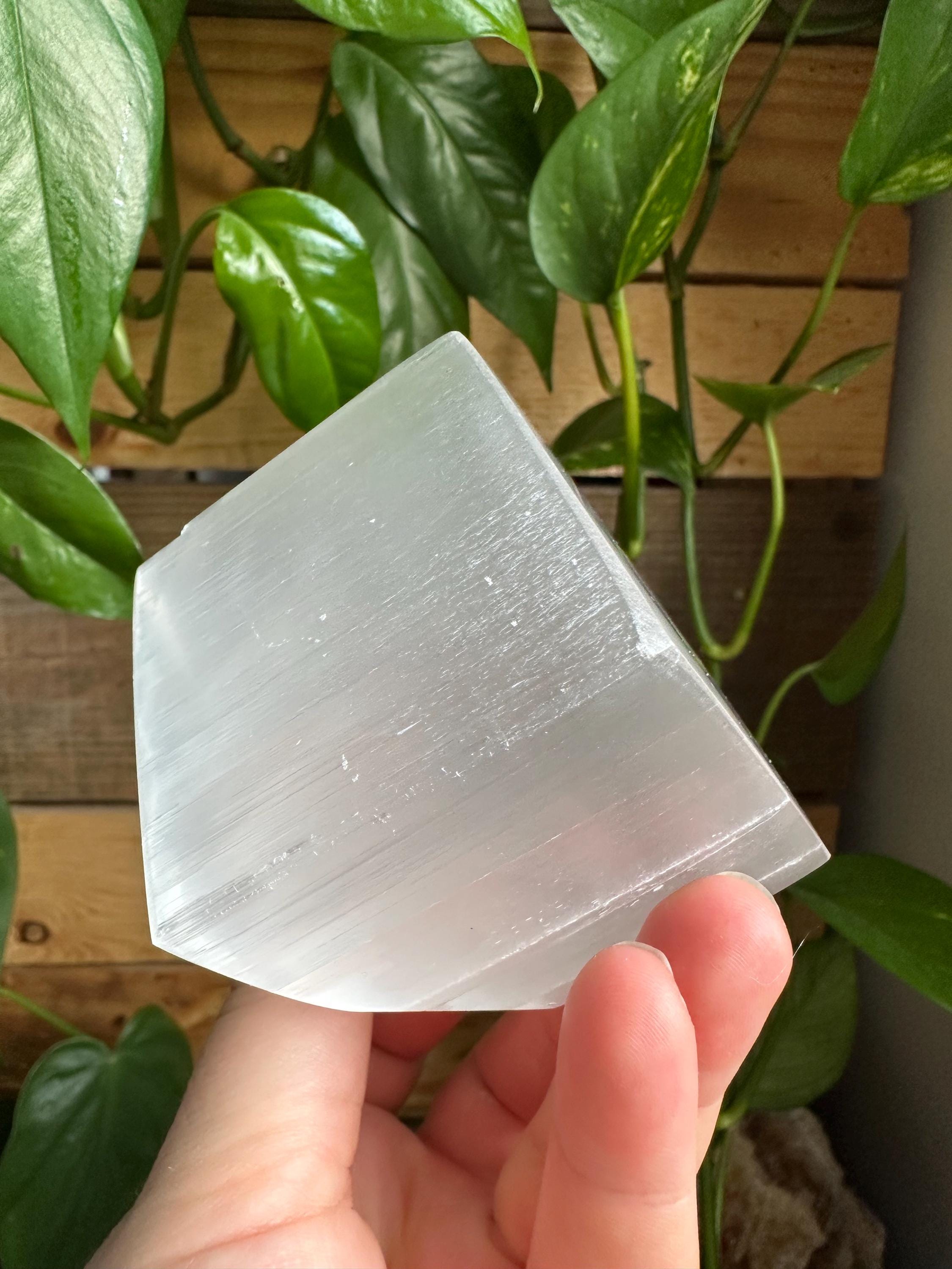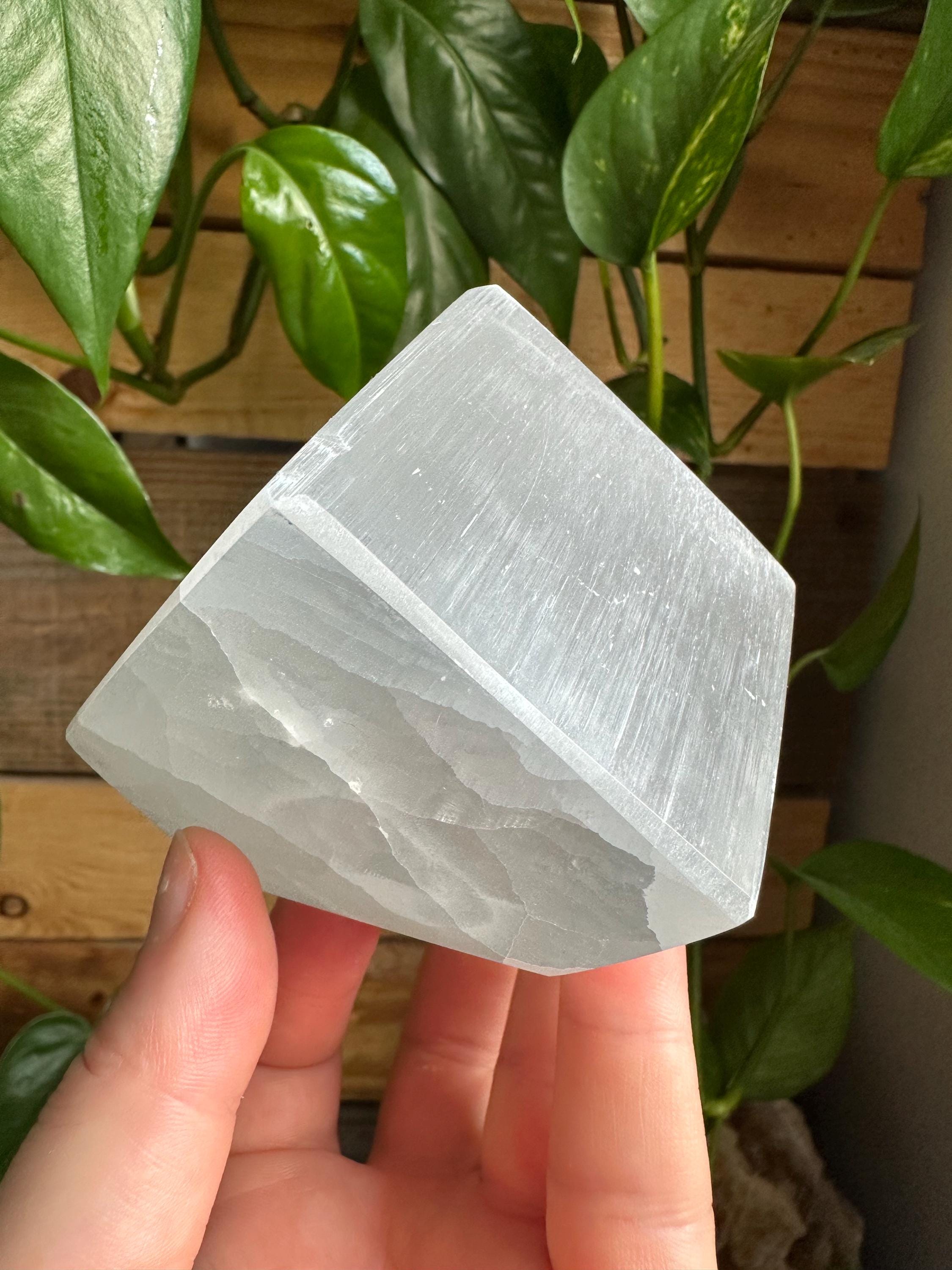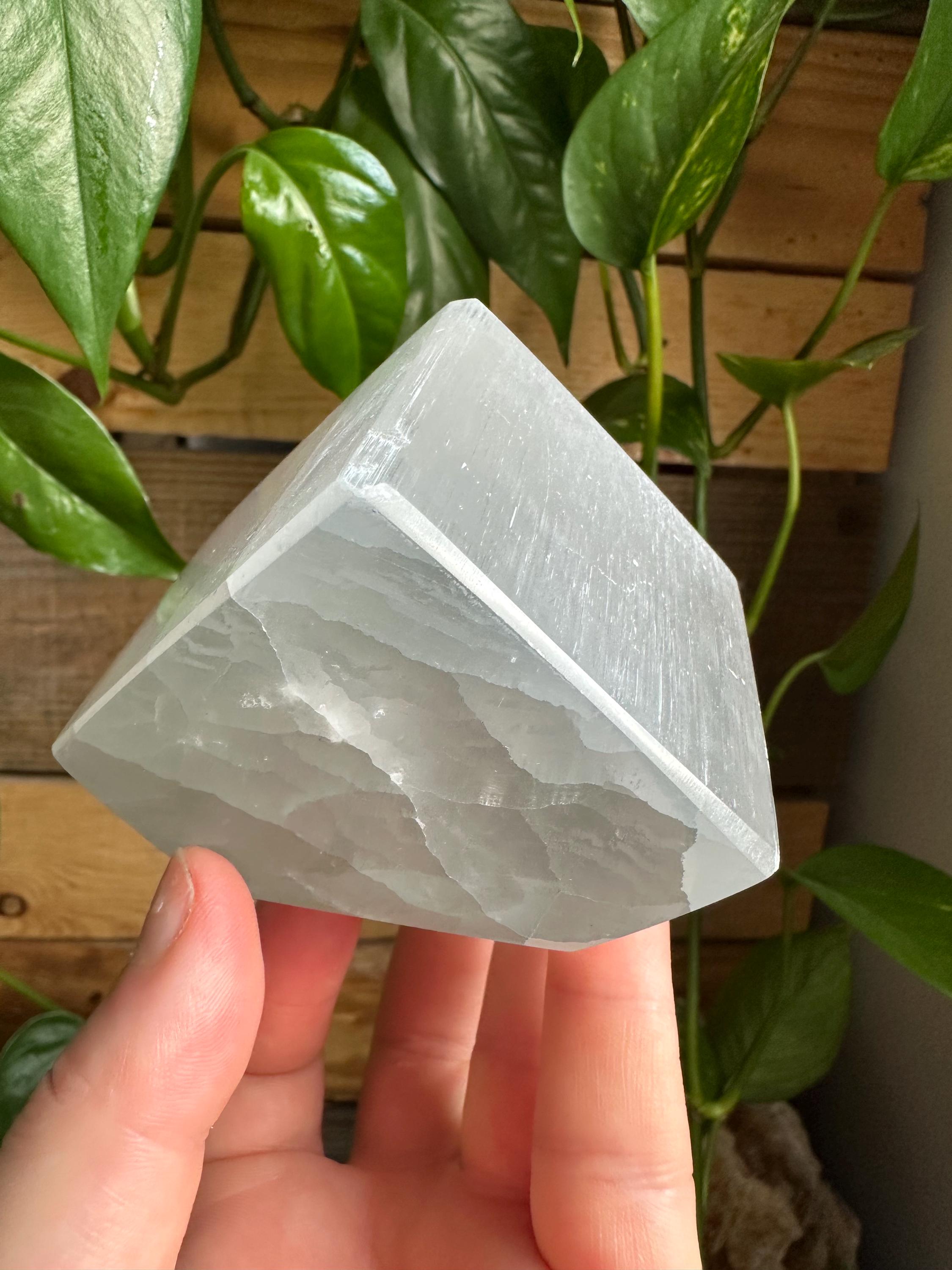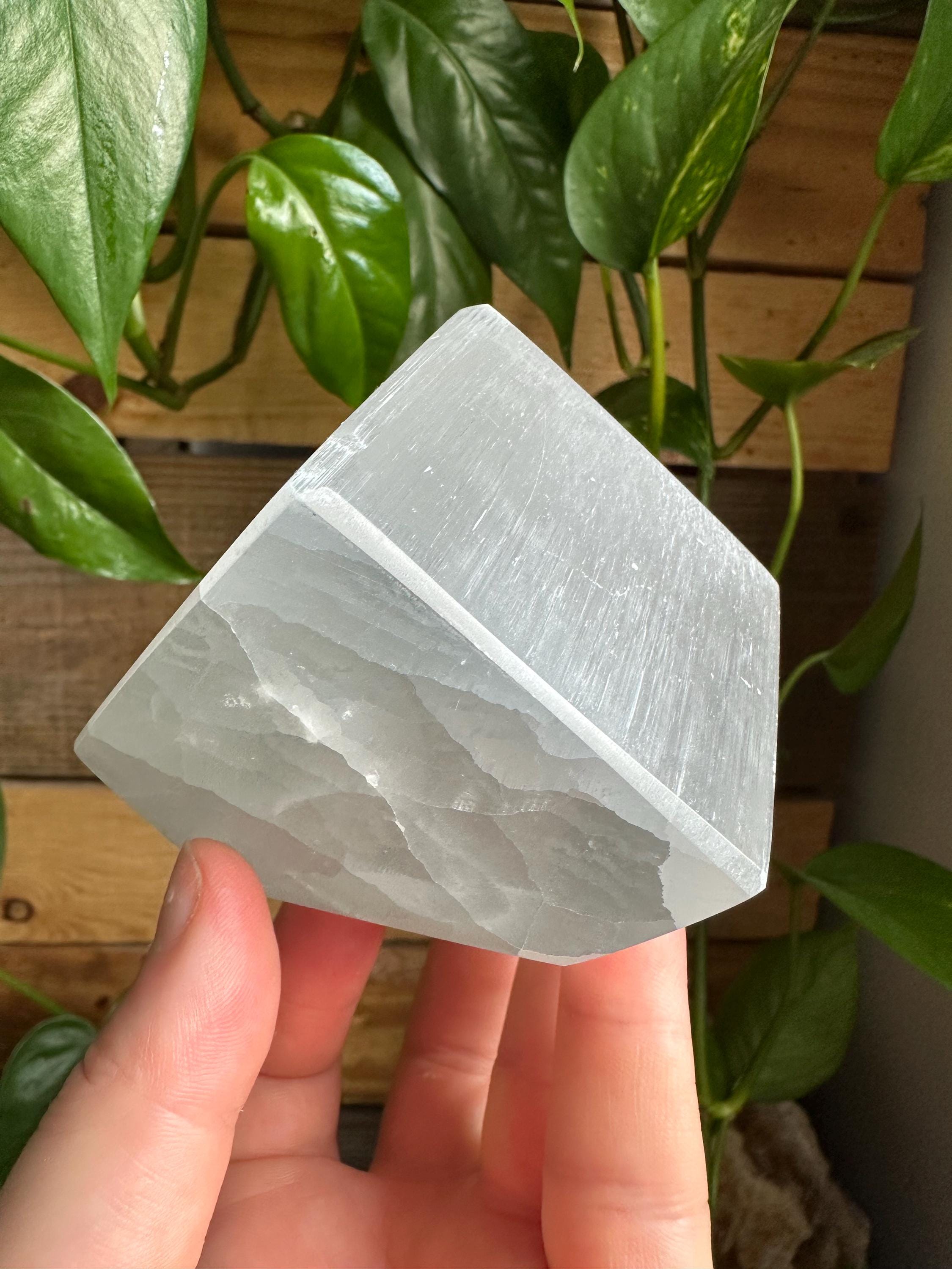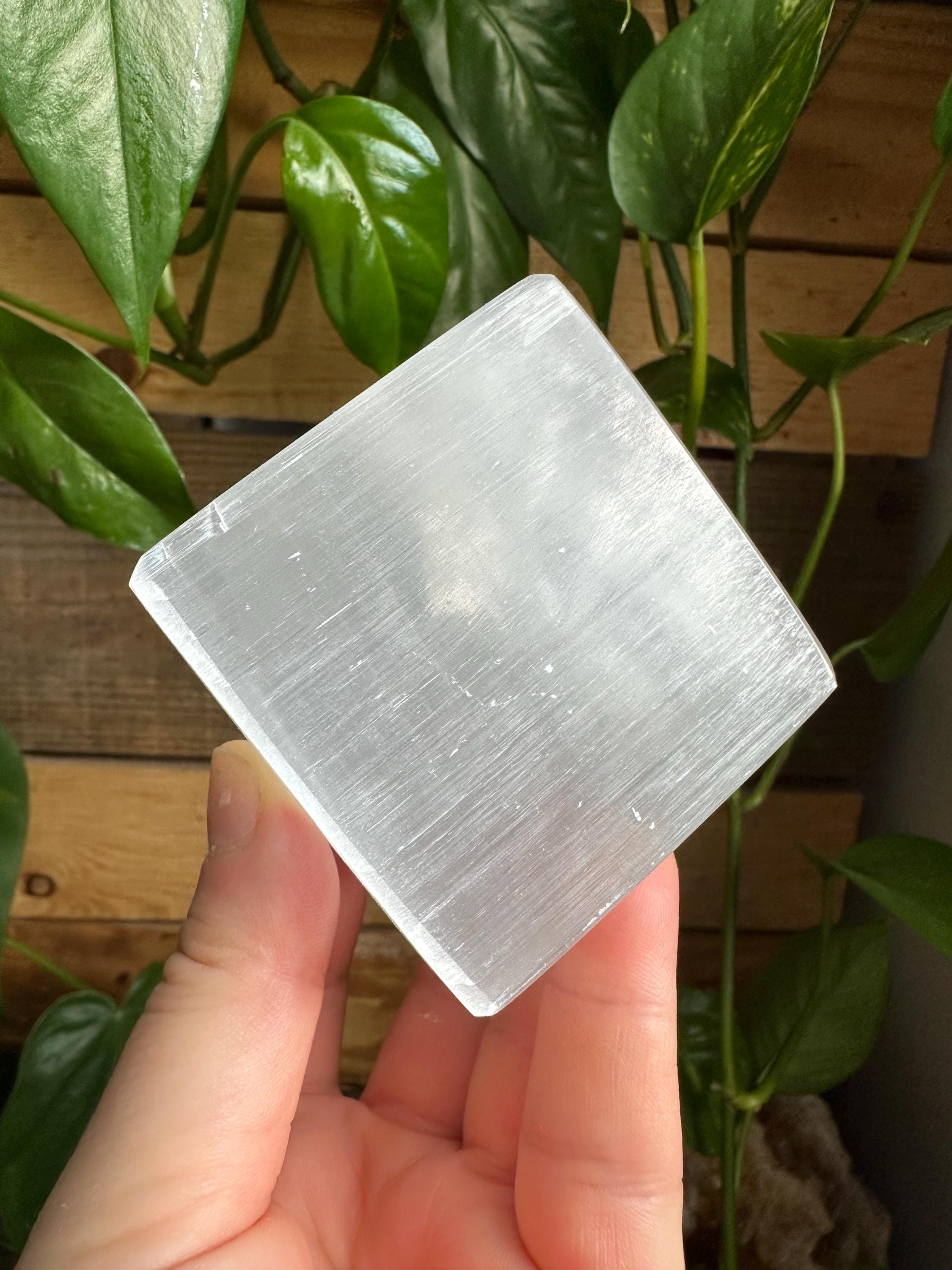 Cool selenite cube. This cube is slightly notched on one corner and can be displayed on the notch if desired, giving it an angled display.